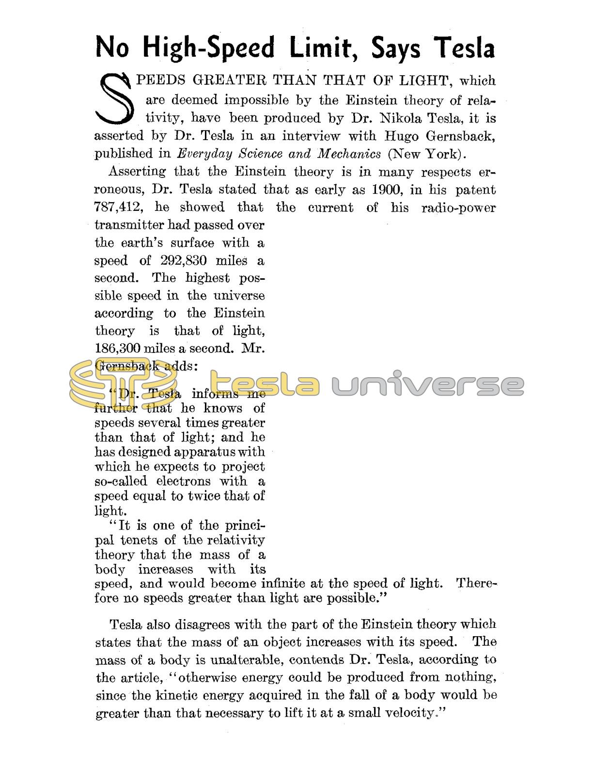 Asserting that the Einstein theory is in many respects erroneous, Dr. Tesla stated that as early as 1900, in his patent 787,412, he showed that the current of his radio-power transmitter had passed over the earth's surface with a speed of 292,830 miles a second. The highest possible speed in the universe according to the Einstein theory is that of light, 186,300 miles a second. Mr. Gernsback adds: