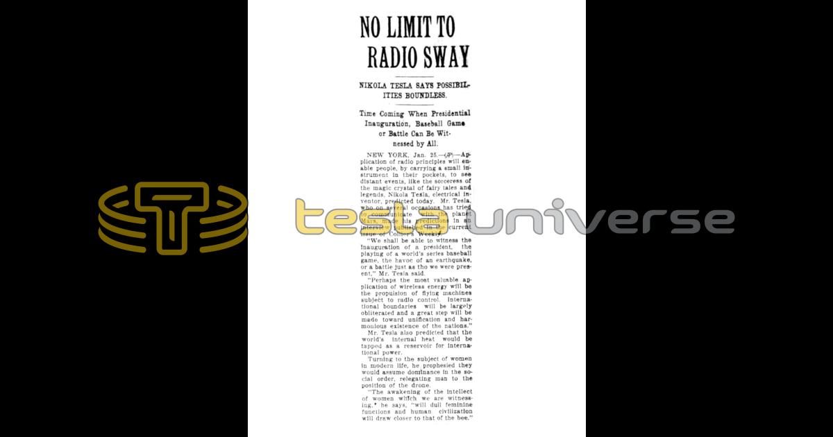 "Perhaps the most valuable application of wireless energy will be the propulsion of flying machines subject to radio control. International boundaries will be largely obliterated and a great step will be made toward unification and harmonious existence of the nations."