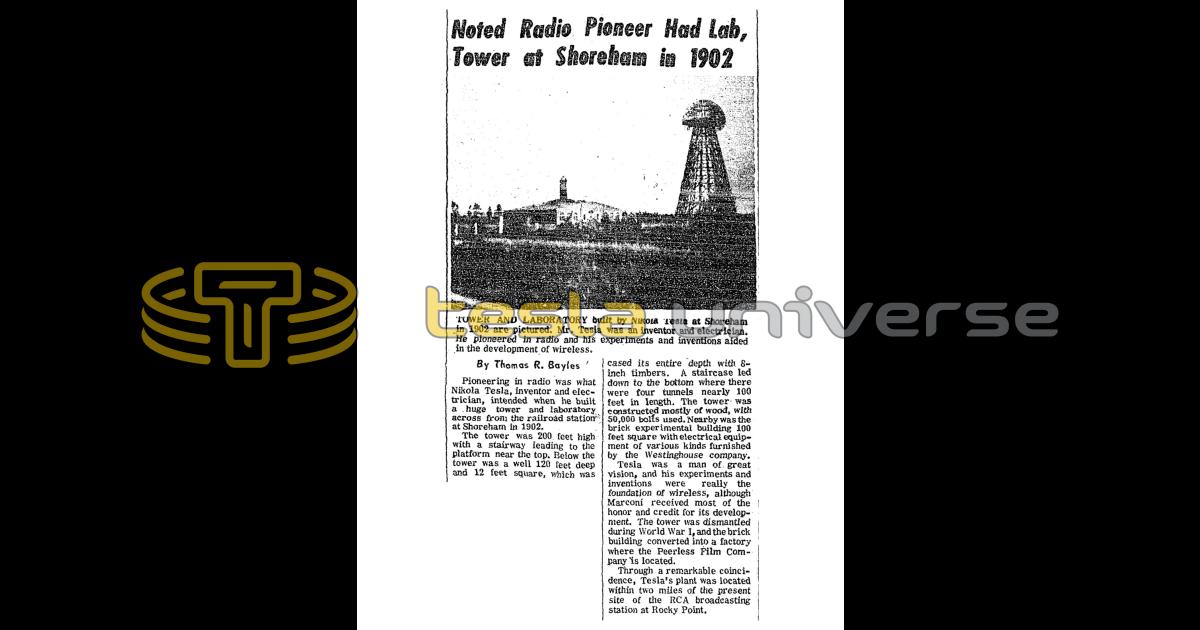 Pioneering in radio was what Nikola Tesla, inventor and electrician, intended when he built a huge tower and laboratory across from the railroad station at Shoreham in 1902.