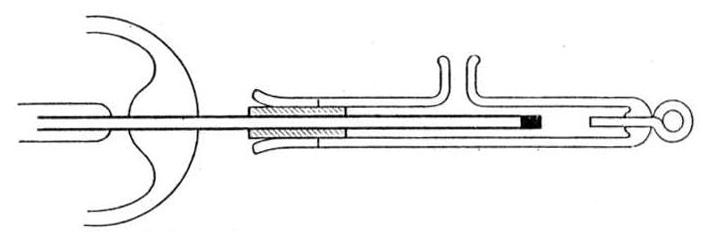 Wrappings may have been appropriate for anything so old and dead as a mummy, but for vacuum tubes which are young and should be vigorous they are out of place. They are fetiches we have worshipped long enough. With any considerable force they get knocked from their pedestals, falling down as discolored fragments in the tube. As the glass wrapping about the anode stem was the first to go I tried the effect of shortening the stem, and finding this was an improvement, I also reduced the length of the wrapping, finally removing it entirely as in the tube here shown December 1, 1897. I next shortened that about the cathode stem and should have early abandoned it if two great experimenters, Lenard and Tesla, had not definitely stated that it was of value. I have now for some time discarded any covering for either terminal, not only without injury to the tube but to its distinct advantage. A tube of this kind is shown in Fig. 50. The method of supporting the bare stems is excellent and when these are of large diameter, three-sixteenths of an inch, the tube will bear any reasonable amount of jar in use or transportation. There is also another point about this tube which is of practical value - the large size of the wire loop forming the connection with the leading wire. These are usually small and delicate. They break easily and are difficult to find in a darkened room. It is irritating to hunt for the place to connect a wire, or to need to use care in its attachment. In some commercial tubes the danger of breaking the little wires is overcome by attaching brass caps on the ends, but these are objectionable as they prevent heating the tube, a process which should always be gone through with before exciting, to diminish the danger of puncture from the powerful current needed to overcome the high vacuums which are required for some work. Even with lower vacuums this preliminary heating is desirable, because with our present knowledge we can not make a tube which will give the same wave-length to the light when the tube is cold as when it has been run and become hot. A tube such as here shown is a small though distinct advance upon the usual commercial types.