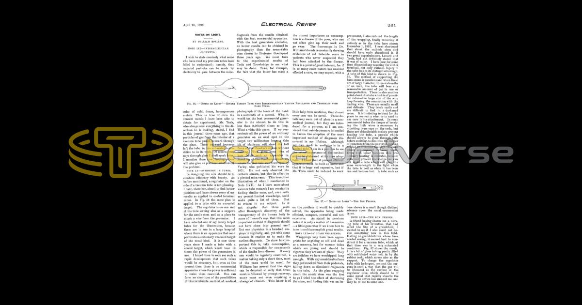 In designing the aim should be to combine efficiency with beauty. As before mentioned, a regulator on the side of a vacuum tube is not pleasing. I have, therefore, aimed to find better positions and have shown some of my results as applied to cooled terminal tubes. In Fig. 56 the same plan is applied to a tube with an uncooled target. The regulator is on one end of the tube serving also as a support for the anode stem and as a place to attach a wire from the generator. I have selected one of my rotary target tubes for the illustration, because these are in use in a large hospital where there is an apparatus that soon perforates a stationary uncooled target of the usual kind. It is now three years since I made a tube with a cooled target, which would bear 10 times the power of the generators in use. I hoped then to soon see such a rapid development that such tubes would be necessary, but, even at the present time, there is no commercial apparatus where the power is sufficient to make thorn essential. One can form no clear idea of the possibilities of this invaluable method of medical diagnosis from the results obtained with the best commercial apparatus. With the best generators available, no better results can be obtained in photography than the remarkable ones shown by Professor Goodspeed three years ago. We must turn to the experimental results of Tesla and Trowbridge to see what may be done. Take, for example, the fact that the latter has made a photograph of the bones of the hand in a millionth of a second. Why, it would tax the best commercial generator to the utmost to do this in less than 2,000,000 times as long. What a vista this opens. If we concentrate all the power of an ordinary generator on an oval spot on the target two millimeters long, a thin bit of platinum will stand the full force of the Crookes’s stream without melting. This gives some idea of how feeble such an apparatus is. Speaking of the Crookes’s stream reminds me that this was discovered by Varley, who published his work in 1871. He not only observed the cathode stream, but also its effect on a pivoted mica vane. This is another illustration of what I mentioned in Note LVII. As I learn more about vacuum tube research I am constantly finding similar cases, and, even with my present limited knowledge, could make quite a list of them. But to return to my subject. Is it not singular that three years after Roentgen’s discovery of the transparency of the human body to some of Lenard’s rays that this most important method of diagnosis should not have come into general use ? Not one physician in a hundred employs it regularly, and yet with some diseases it enables us to make the earliest diagnosis. To show how important this is, take consumption, which is responsible for one-seventh of the deaths from disease. If every one would be regularly examined, a matter taking only a short time, most of the cases could be saved, for Williams has proved that the signs can be detected so early that treatment is followed by prompt recovery, many cases not even requiring a change of climate. This latter is of the utmost importance as consumption is a disease of the poor, who can not often give up their work and go away. The fluoroscope in Dr. Williams’s hands is constantly showing evidences of old tubercle scars in patients who never suspected they had been attacked by the disease. This is a point of great interest, for if in so many cases nature has unaided effected a cure, we may expect, with a little help from medicine, that almost every case can be saved. These details may seem out of place in a nonmedical journal, but they are introduced for a purpose, as I am convinced that outside pressure is needed to hasten the adoption of the most important method of diagnosis discovered in my lifetime. Although my own work in medicine is in a limited field, I am in a position to see the prime importance of the method and to be distressed at its slow adoption. I know that at present efficient apparatus must be built at home and that it is large and expensive, but if Mr. Tesla could be induced to work on the problem it would be quickly solved, the apparatus being made efficient, compact, powerful and not expensive. As stated in previous notes it is only a matter of harmonics - a little generator if we knew how to tune it could accomplish great results.