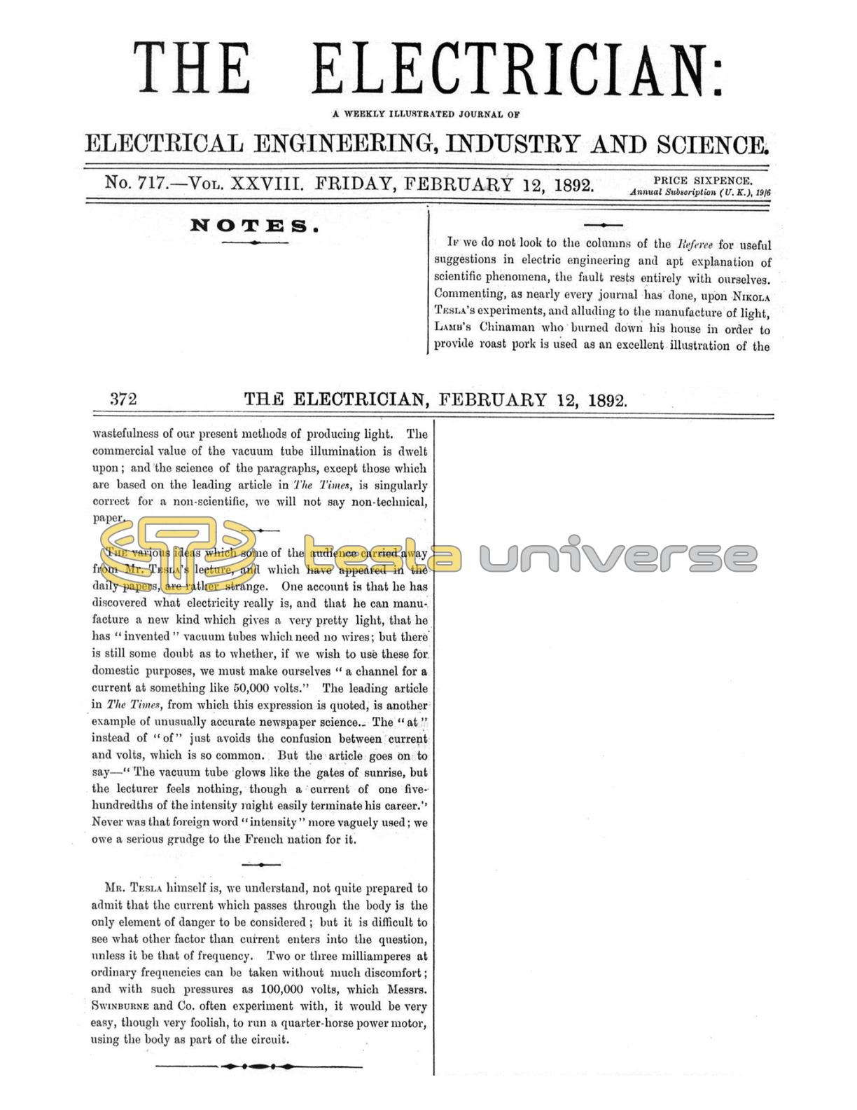 The various ideas which some of the audience carried away from Mr. Tesla’s lecture, and which have appeared in the daily papers, are rather strange. One account is that he has discovered what electricity really is, and that he can manufacture a new kind which gives a very pretty light, that he has “invented” vacuum tubes which need no wires; but there is still some doubt as to whether, if we wish to use these for domestic purposes, we must make ourselves “a channel for a current at something like 50,000 volts.” The leading article in The Times, from which this expression is quoted, is another example of unusually accurate newspaper science. The “at” instead of “of” just avoids the confusion between current and volts, which is so common. But the article goes on to say - “The vacuum tube glows like the gates of sunrise, but the lecturer feels nothing, though a current of one five-hundredths of the intensity might easily terminate his career.” Never was that foreign word “intensity” more vaguely used; we owe a serious grudge to the French nation for it.