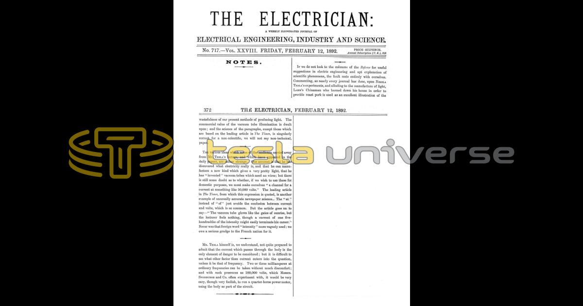 If we do not look to the columns of the Referee for useful suggestions in electric engineering and apt explanation of scientific phenomena, the fault rests entirely with ourselves. Commenting, as nearly every journal has done, upon Nikola Tesla’s experiments, and alluding to the manufacture of light, Lamb’s Chinaman who burned down his house in order to provide roast pork is used as an excellent illustration of the wastefulness of our present methods of producing light. The commercial value of the vacuum tube illumination is dwelt upon; and the science of the paragraphs, except those which are based on the leading article in The Times, is singularly correct for a non-scientific, we will not say non-technical, paper.