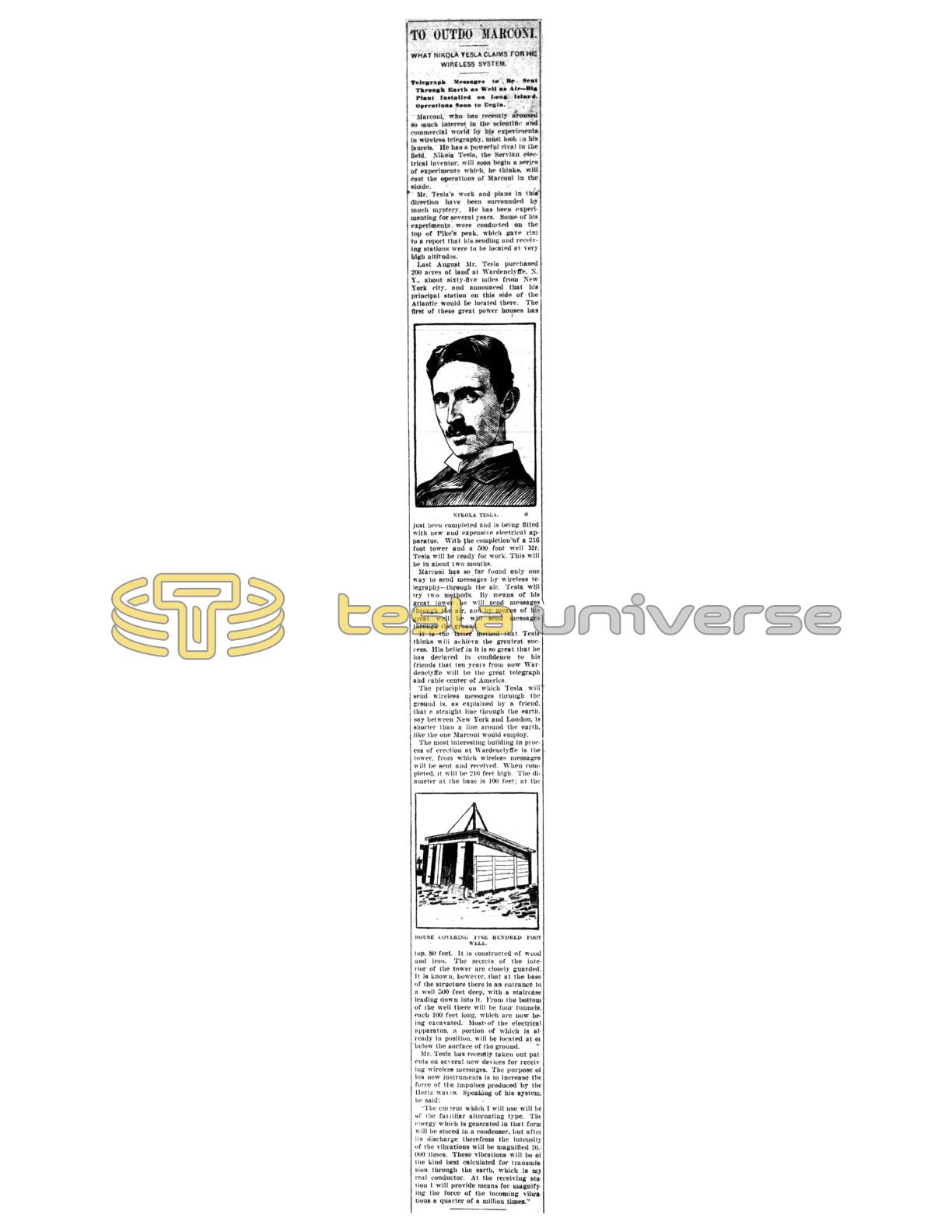 It is the latter method that. Tesla thinks will achieve the greatest success. His belief in it is so great that he has declared in confidence to his friends that ten years from now Wardenclyffe will be the great telegraph and cable center of America.