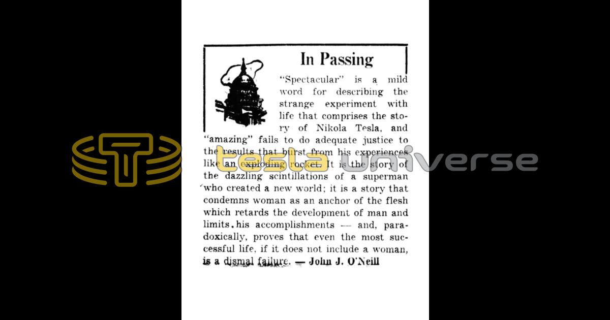 "Spectacular" is a mild word for describing the strange experiment with life that comprises the story of Nikola Tesla, and "amazing" fails to do adequate justice to the results that burst from his experiences like an exploding rocket. It is the story of the dazzling scintillations of a superman 'who created a new world; it is a story that condemns woman as an anchor of the flesh which retards the development of man and limits. his accomplishments — and, paradoxically, proves that even the most successful life, if it does not include a woman, is a dismal failure. - John J. O'Neill