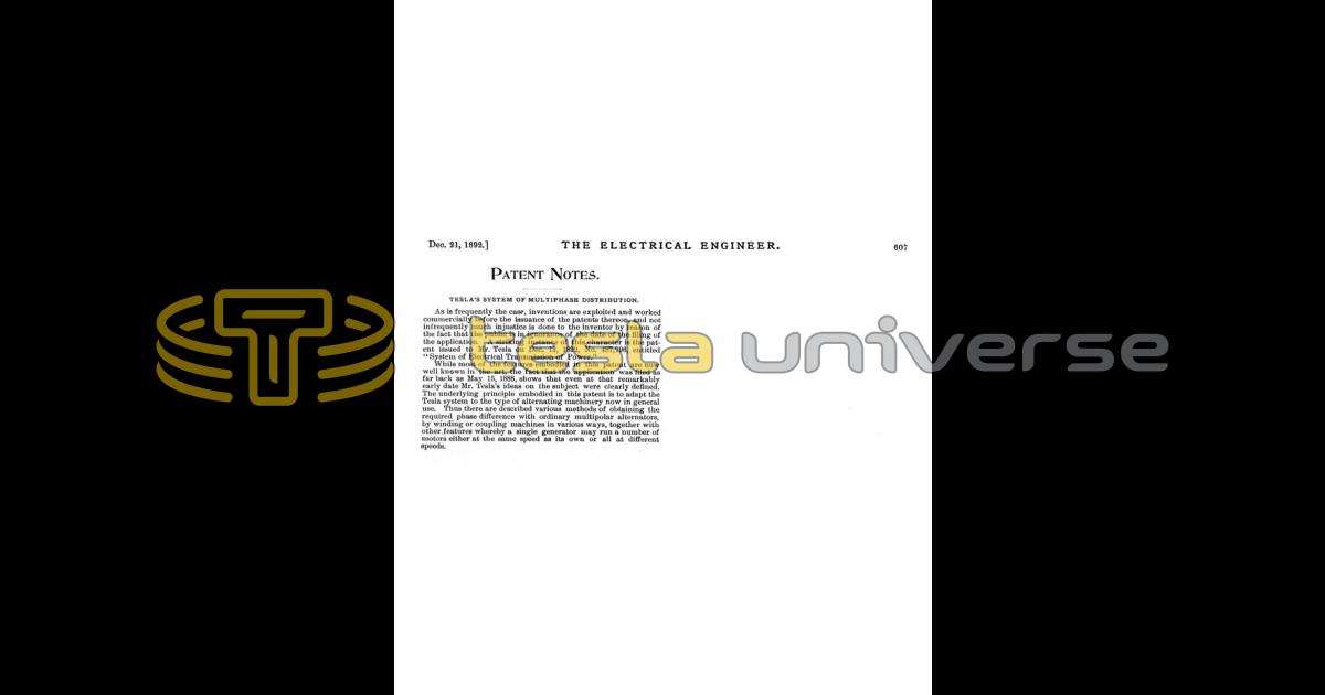 While most of the features embodied in this patent are now well known in the art, the fact that the application was filed as far back as May 15, 1888, shows that even at that remarkably early date Mr. Tesla's ideas on the subject were clearly defined. The underlying principle embodied in this patent is to adapt the Tesla system to the type of alternating machinery now in general use. Thus there are described various methods of obtaining the required phase difference with ordinary multipolar alternators, by winding or coupling machines in various ways, together with other features whereby a single generator may run a number of motors either at the same speed as its own or all at different speeds.