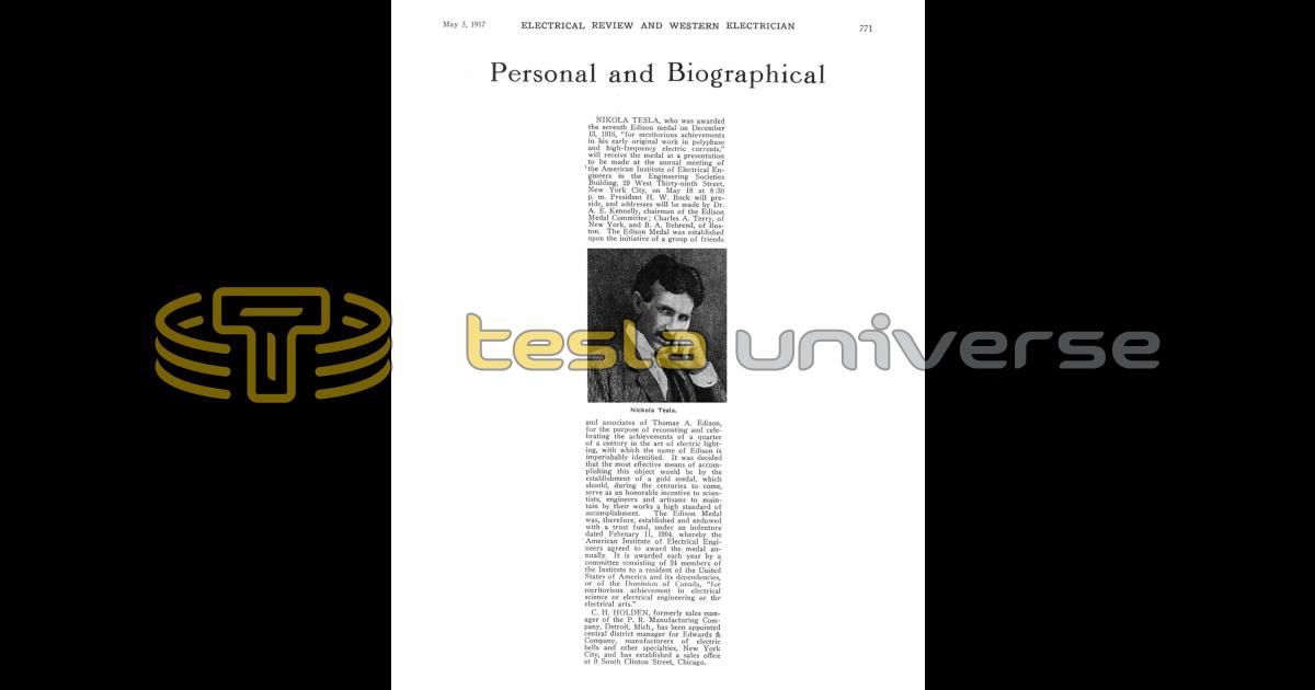 Nikola Tesla, who was awarded the seventh Edison medal on December 13, 1916, "for meritorious achievements in his early original work in polyphase and high-frequency electric currents," will receive the medal at a presentation to be made at the annual meeting of the American Institute of Electrical Engineers in the Engineering Societies Building, 29 West Thirty-ninth Street, New York City, on May 18 at 8:30 p. m. President H. W. Buck will preside, and addresses will be made by Dr.. A. E. Kennelly, chairman of the Edison Medal Committee; Charles A. Terry, of New York, and B. A. Behrend, of Boston.