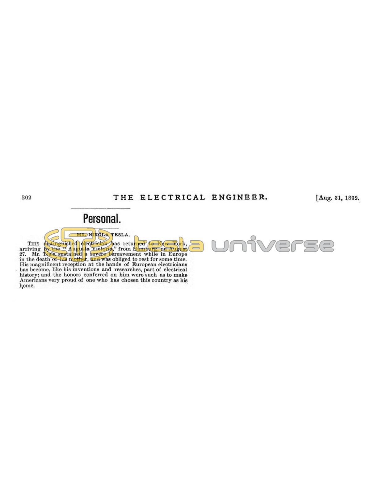 This distinguished electrician has returned to New York, arriving by the "Augusta Victoria," from Hamburg, on August 27. Mr. Tesla sustained a severe bereavement while in Europe in the death of his mother, and was obliged to rest for some time. His magnificent reception at the hands of European electricians has become, like his inventions and researches, part of electrical history; and the honors conferred on him were such as to make Americans very proud of one who has chosen this country as his home.