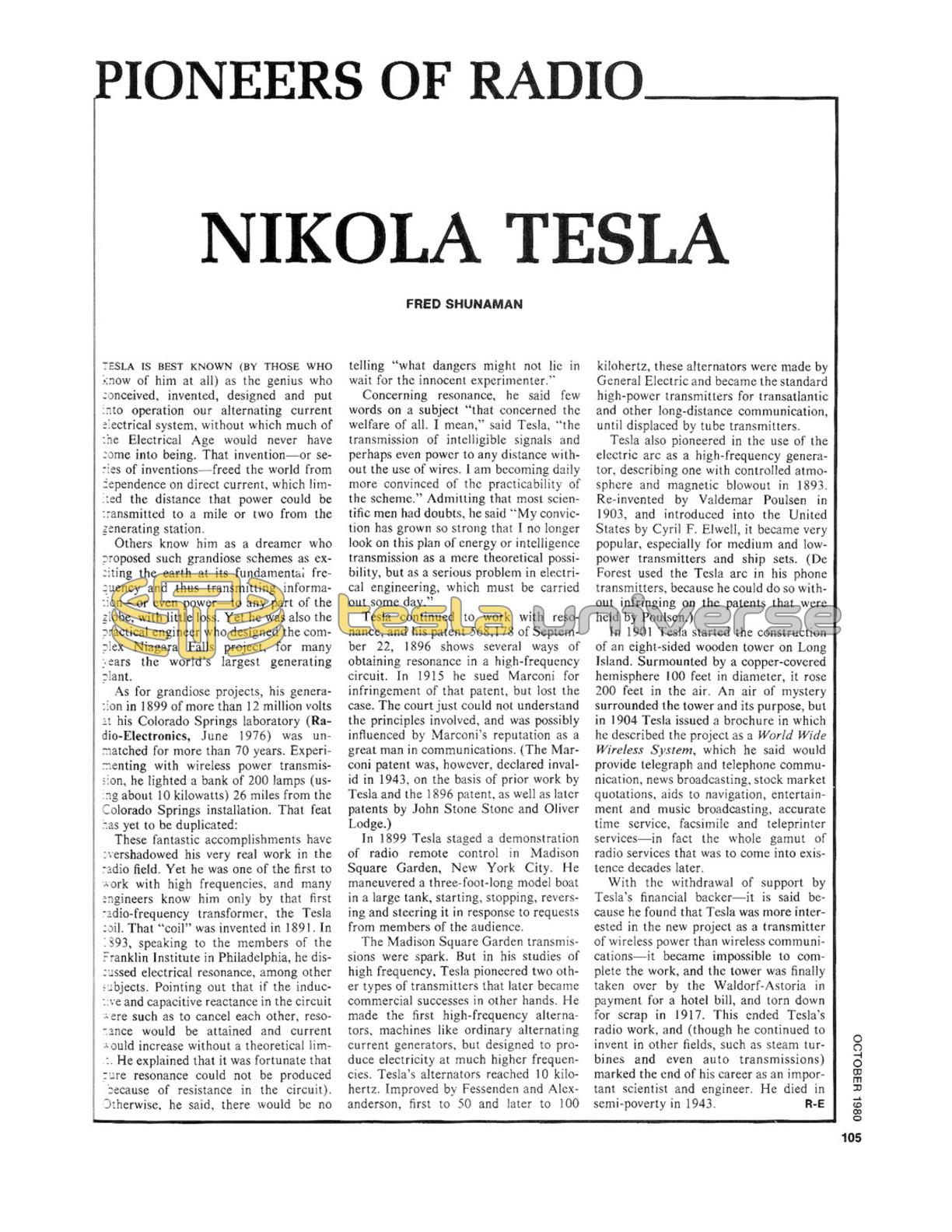 As for grandiose projects, his generation in 1899 of more than 12 million volts at his Colorado Springs laboratory (Radio-Electronics, June 1976) was unmatched for more than 70 years. Experimenting with wireless power trans mission, he lighted a bank of 200 lamps (using about 10 kilowatts) 26 miles from the Colorado Springs installation. That feat has yet to be duplicated.