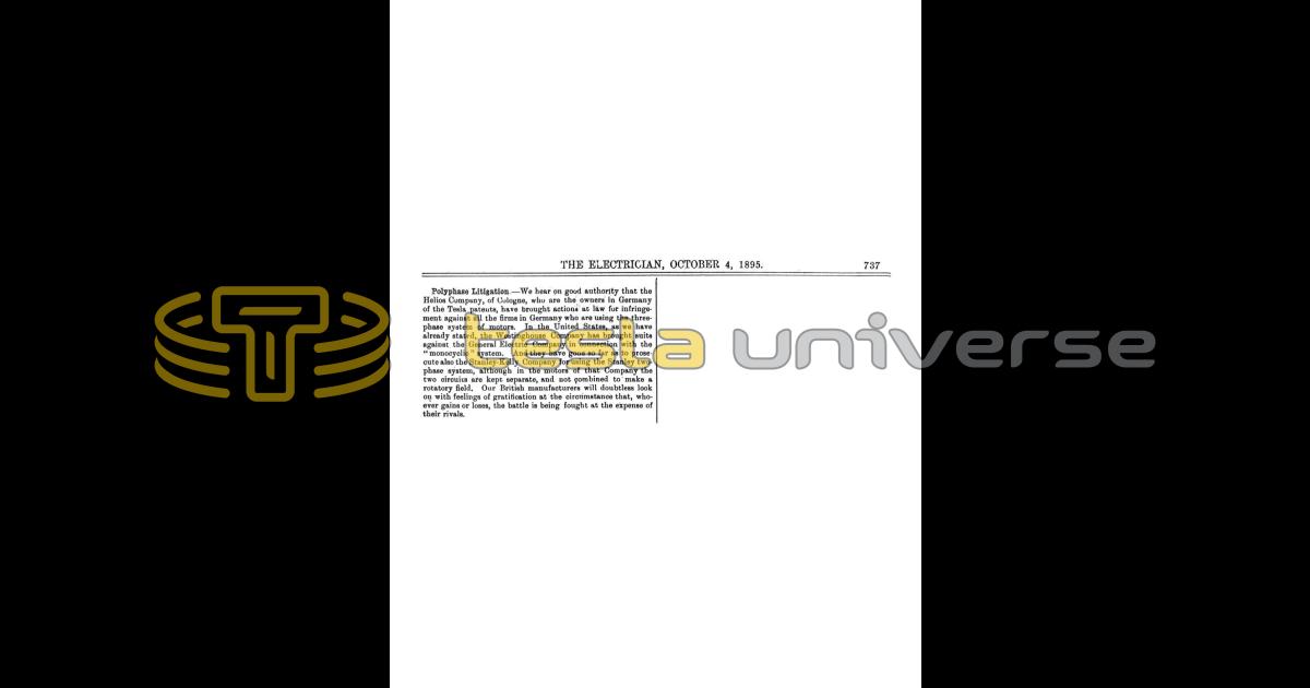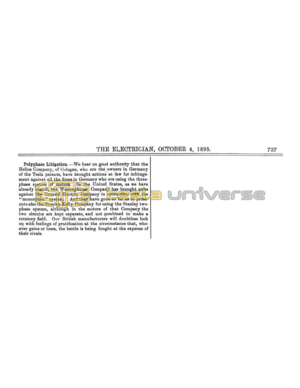 We hear on good authority that the Helios Company, of Cologne, who are the owners in Germany of the Tesla patents, have brought actions at law for infringement against all the firms in Germany who are using the three-phase system of motors. In the United States, as we have already stated, the Westinghouse Company has brought suits against the General Electric Company in connection with the "monocyclic" system. And they have gone so far as to prosecute also the Stanley-Kelly Company for using the Stanley two-phase system, although in the motors of that Company the two circuits are kept separate, and not combined to make a rotatory field, Our British manufacturers will doubtless look on with feelings of gratification at the circumstance that, whoever gains or loses, the battle is being fought at the expense of their rivals.