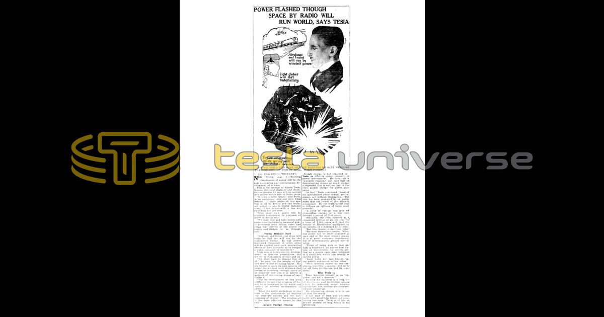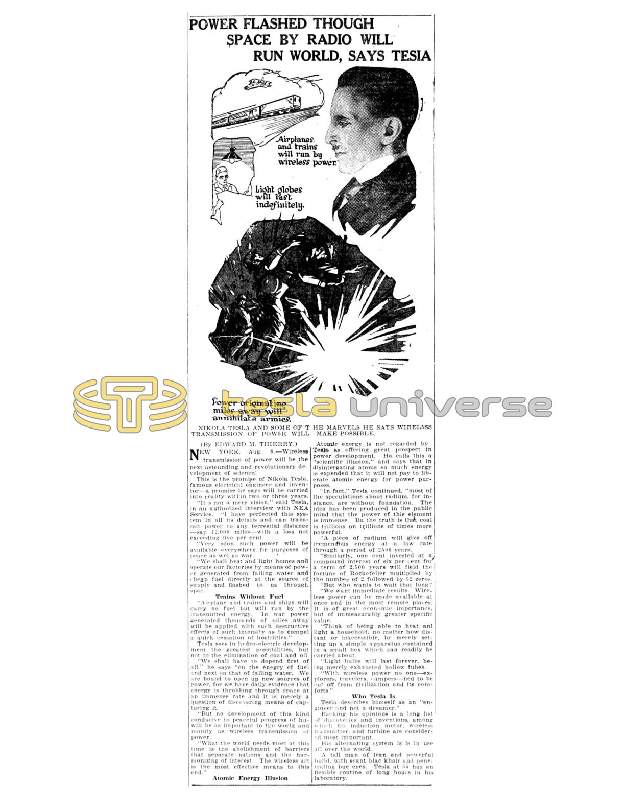 "Airplane and trains and ships will carry no fuel but will run by the transmitted energy. In war power generated thousands of miles away will be applied with such destructive effects of such intensity as to compel a quick cessation of hostilities."