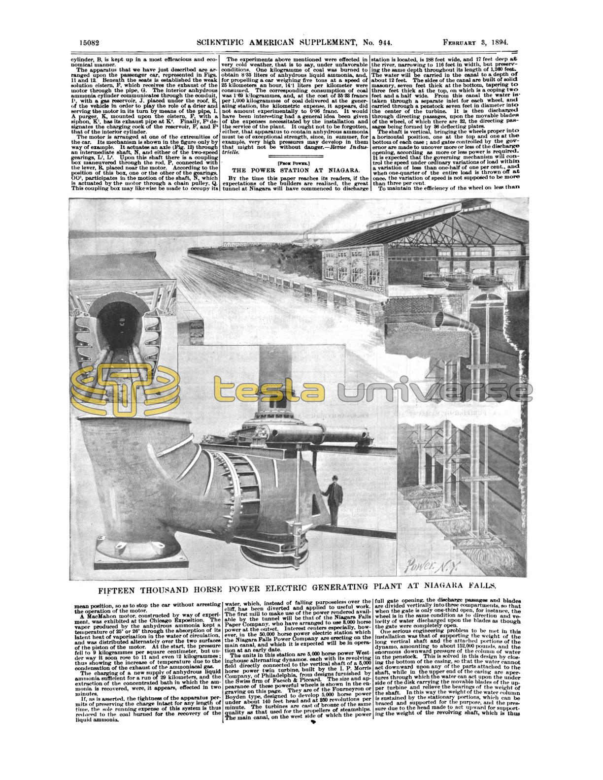 The dynamos are constructed upon the two-phase alternating current system, with stationary armature and revolving fields, and are designed to generate a potential of 2,000 to 2,400 volts, which will be increased or diminished by step-up or step-down transformers for transmission or local use. Motor generators will be run for the production of continuous current when required, so that the station will be able to furnish continuous or alternating current of any potential. Two-phase Tesla motors will be used. The station is designed eventually to comprise ten of the units described, and the wheel pit and building will be extended toward the river and new wheels put in as required. Meantime power from the station itself will be available for carrying on the work, extending the wheel pit and the main tunnel, and the many mechanical operations connected with grading and inaugurating the industrial city which will grow up about this source of cheap and continuous power.