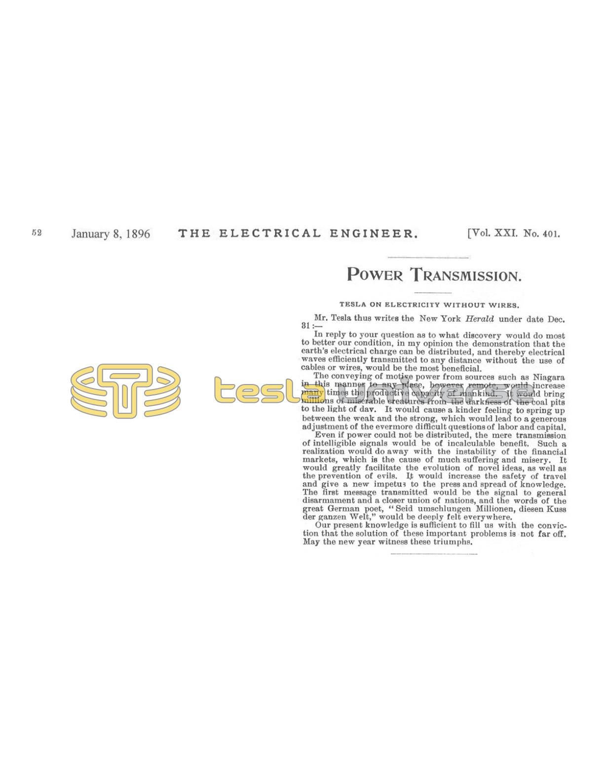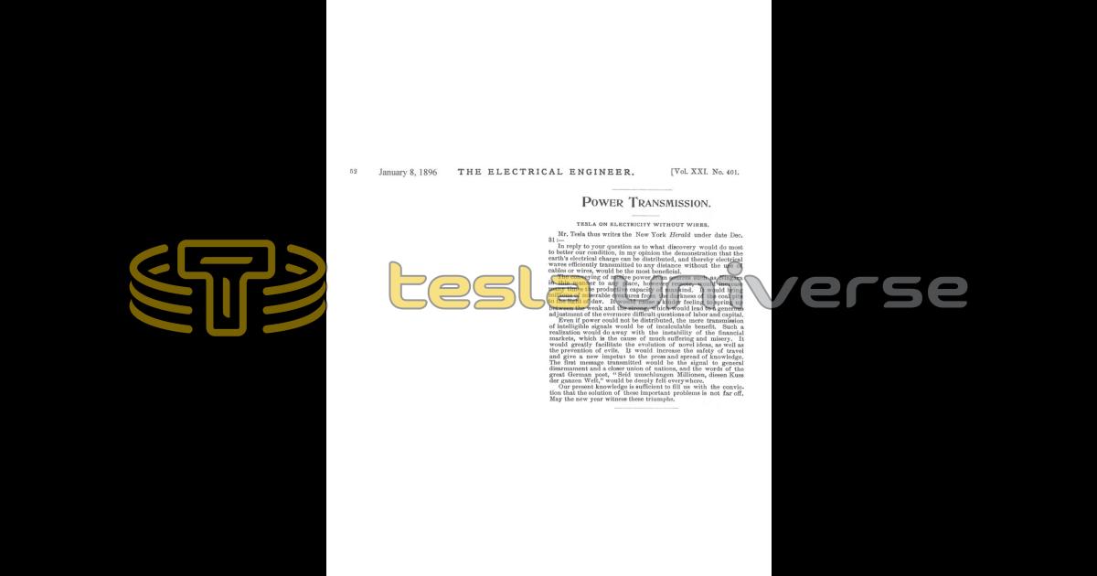 Nikola Tesla Articles Newspaper and magazine articles related to Nikola Tesla Power Transmission (reprint) Electrical Engineer January 8th, 1896 Page number(s): 52 This article is a reprint from New York Herald of January 1, 1896 and is intentionally not duplicated here. Downloads Downloads for this article are available to members.Log in or join today to access all content. Downloads Downloads for this article are available to members.Log in or join today to access all content. Pagination Enjoy other articles First First item Previous Previous item Next Next item Last Last item Within the Universe Timeline Important moments and events related to Tesla. Articles Nikola Tesla in the press. Books Books written by and about Nikola Tesla. Documents Nikola Tesla documents, files and papers. Quotes Profound and insightful quotes by Nikola Tesla. Movies and TV Nikola Tesla on the screen. Patents Nikola Tesla held around 200 patents worldwide. Landmarks Locations related to Nikola Tesla. Images Nikola Tesla image and photo library. Show more Pagination Enjoy other articles First First item Previous Previous item Next Next item Last Last item Within the Universe Documents Nikola Tesla documents, files and papers. Quotes Profound and insightful quotes by Nikola Tesla. Books Books written by and about Nikola Tesla. Timeline Important moments and events related to Tesla. Patents Nikola Tesla held around 200 patents worldwide. Images Nikola Tesla image and photo library. Landmarks Locations related to Nikola Tesla. Letters Letters to, from and about Nikola Tesla. Movies and TV Nikola Tesla on the screen.