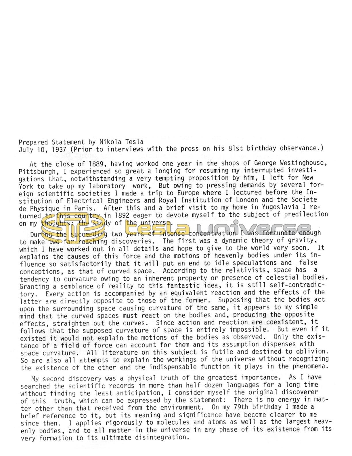 Prepared Statement by Nikola Tesla