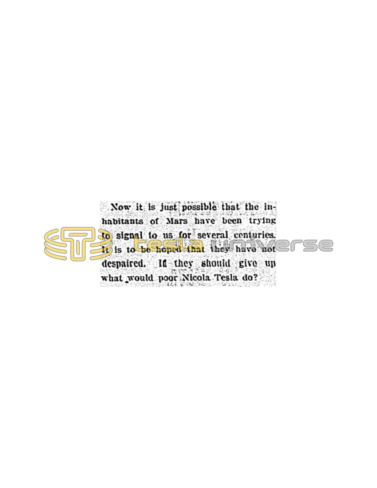 Now it is just possible that the inhabitants of Mars have been trying to signal to us for several centuries. It is to be hoped that they have not despaired. If they should give up what would poor Nicola Tesla do?
