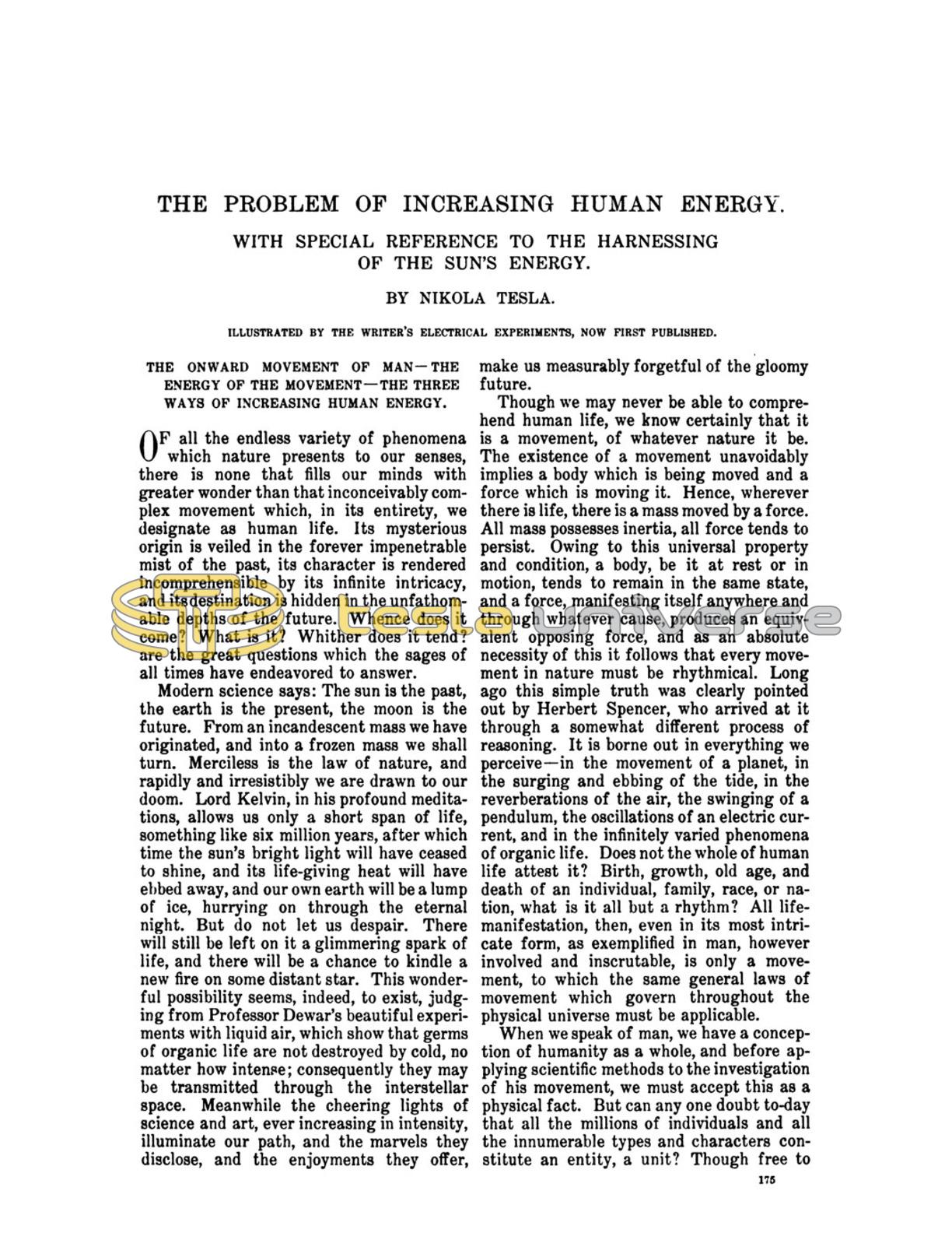 Of the three possible solutions of the main problem of increasing human energy, this is by far the most important to consider, not only because of its intrinsic significance, but also because of its intimate bearing on all the many elements and conditions which determine the movement of humanity. In order to proceed systematically, it would be necessary for me to dwell on all those considerations which have guided me from the outset in my efforts to arrive at a solution, and which have led me, step by step, to the results I shall now describe. As a preliminary study of the problem an analytical investigation, such as I have made, of the chief forces which determine the onward movement, would be of advantage, particularly in conveying an idea of that hypothetical “velocity” which, as explained in the beginning, is a measure of human energy; but to deal with this specifically here, as I would desire, would lead me far beyond the scope of the present subject. Suffice it to state that the resultant of all these forces is always in the direction of reason, which, therefore, determines, at any time, the direction of human movement. This is to say that every effort which is scientifically applied, rational, useful, or practical, must be in the direction in which the mass is moving. The practical, rational man, the observer, the man of business, he who reasons, calculates, or determines in advance, carefully applies his effort so that when coming into effect it will be in the direction of the movement, making it thus most efficient, and in this knowledge and ability lies the secret of his success. Every new fact discovered, every new experience or new element added to our knowledge and entering into the domain of reason, affects the same and, therefore, changes the direction of movement, which, however, must always take place along the resultant of all those efforts which, at that time, we designate as reasonable, that is, self-preserving, useful, profitable, or practical. These efforts concern our daily life, our necessities and comforts, our work and business, and it is these which drive man onward.