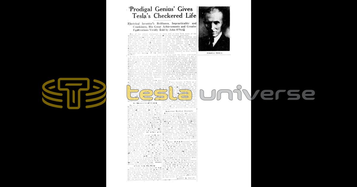 John O'Neill of the Tribune was fascinated by the riddle of Tesla and has just come out with a biography which he calls "Prodigal Genius: The Life of Nikola Tesla" (Ives Washburn: $3.75). Writing so soon after the subject's death has advantages, for the author knew Tesla and has been able to talk with some of his surviving business associates.