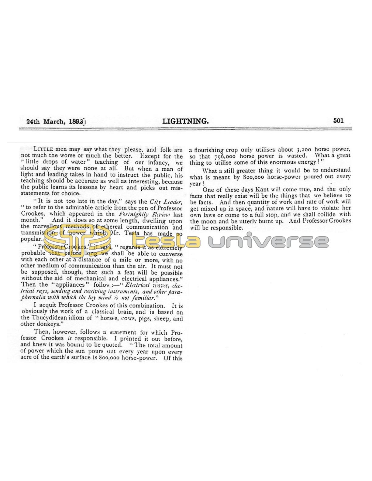 “It is not too late in the day,” says the City Leader, “to refer to the admirable article from the pen of Professor Crookes, which appeared in the Fortnightly Review last month.” And it does so at some length, dwelling upon the marvellous methods of ethereal communication and transmission of power which Mr. Tesla has made so popular.