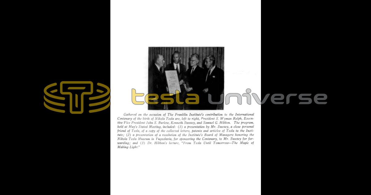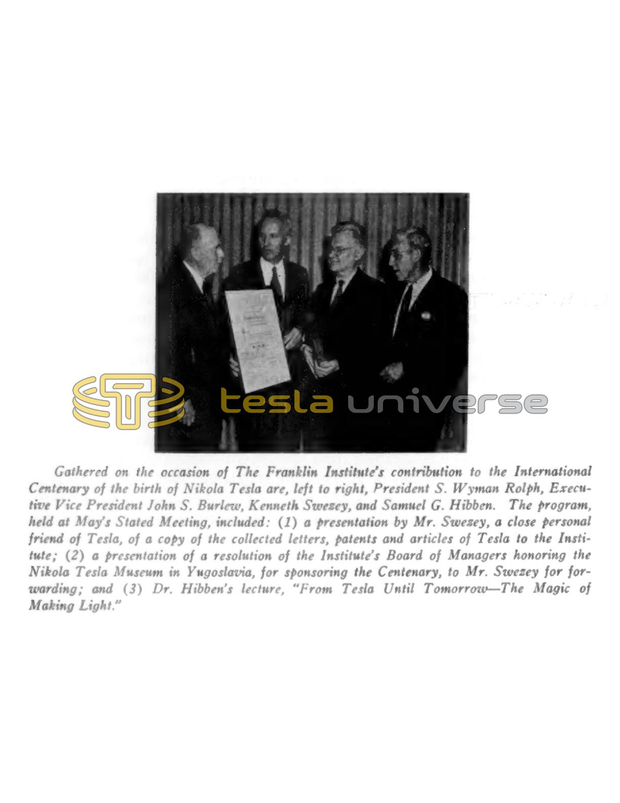 Gathered on the occasion of The Franklin Institute's contribution to the International Centenary of the birth of Nikola Tesla are, left to right, President S. Wyman Rolph, Executive Vice President John S. Burlew, Kenneth Swezey, and Samuel G. Hibben. The program, held at May's Stated Meeting, included: (1) a presentation by Mr. Swezey, a close personal friend of Tesla, of a copy of the collected letters, patents and articles of Tesla to the Institute; (2) a presentation of a resolution of the Institute's Board of Managers honoring the Nikola Tesla Museum in Yugoslavia, for sponsoring the Centenary, to Mr. Swezey for forwarding; and (3) Dr. Hibben's lecture, "From Tesla Until Tomorrow — The Magic of Making Light."