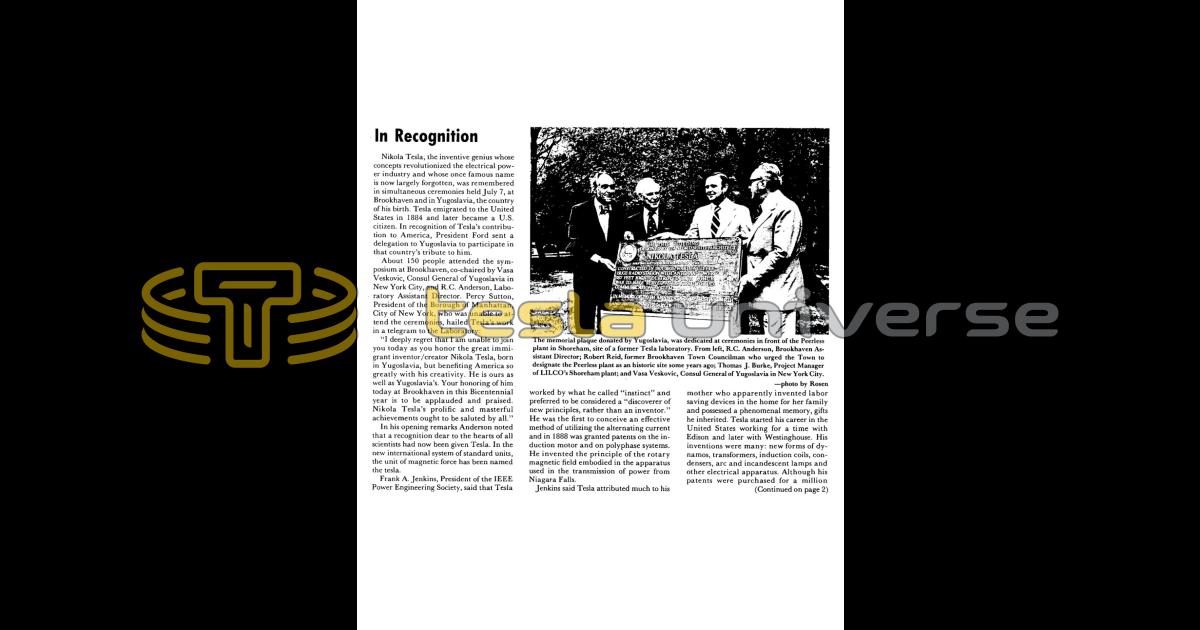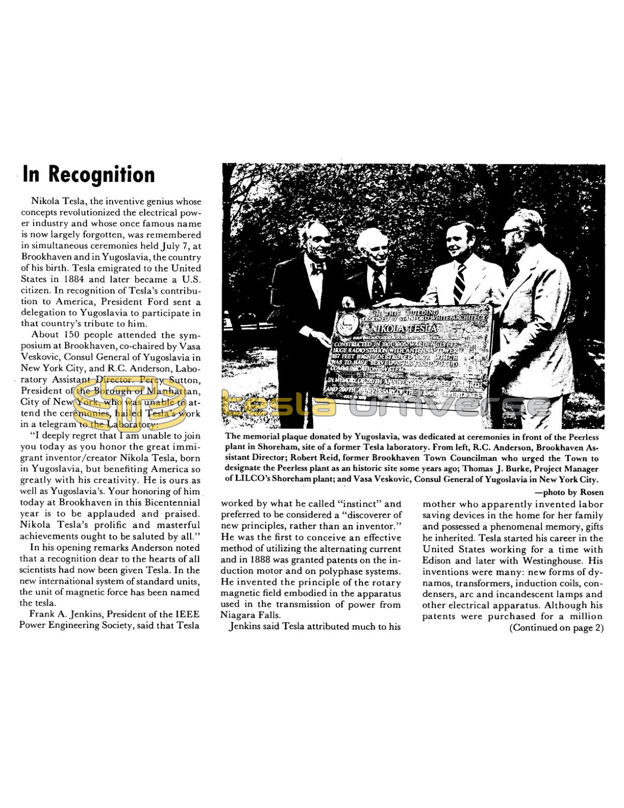 Nikola Tesla, the inventive genius whose concepts revolutionized the electrical power industry and whose once famous name is now largely forgotten, was remembered in simultaneous ceremonies held July 7, at Brookhaven and in Yugoslavia, the country of his birth. Tesla emigrated to the United States in 1884 and later became a U.S. citizen. In recognition of Tesla's contribution to America, President Ford sent a delegation to Yugoslavia to participate in that country's tribute to him.