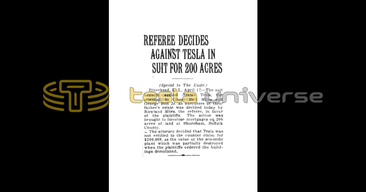 Riverhead, L, L., April 17 — The suit brought against Nikola Tesla, the scientist, by Clover Bolt Miles and George Bolt Jr. as executors of their father's estate was decided today by Rowland Miles, the referee, in favor The action was of the plaintiffs. brought to foreclose mortgages on 200 acres of land at Shoreham, Suffolk County.