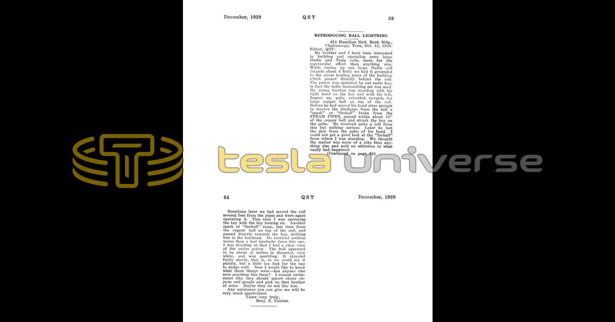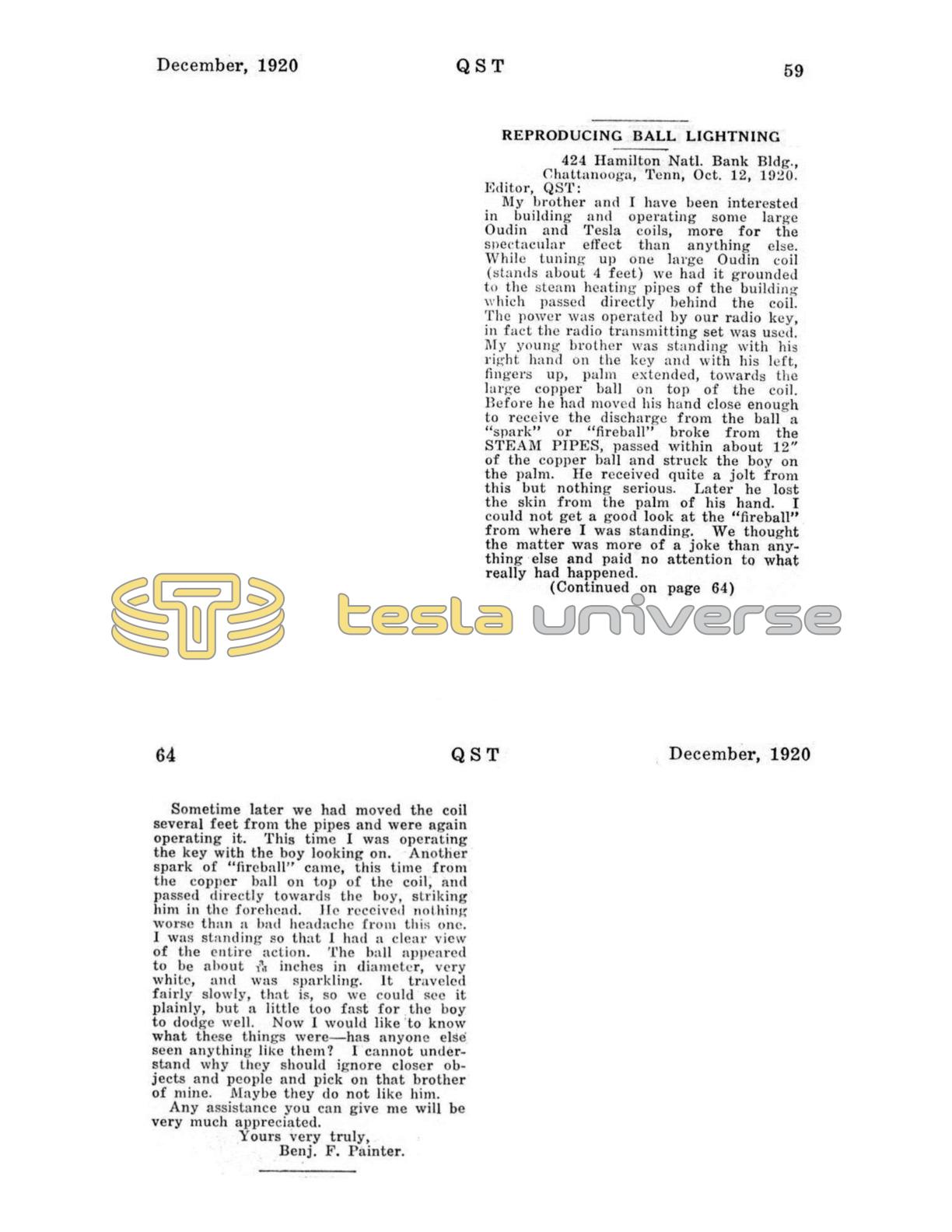 My brother and I have been interested in building and operating some large Oudin and Tesla coils, more for the spectacular effect than anything else. While tuning up one large Oudin coil (stands about 4 feet) we had it grounded to the steam heating pipes of the building which passed directly behind the coil. The power was operated by our radio key, in fact the radio transmitting set was used. My young brother was standing with his right hand on the key and with his left, fingers up, palm extended, towards the large copper ball on top of the coil. Before he had moved his hand close enough to receive the discharge from the ball a "spark" or "fireball" broke from the STEAM PIPES, passed within about 12" of the copper ball and struck the boy on the palm. He received quite a jolt from this but nothing serious. Later he lost the skin from the palm of his hand. I could not get a good look at the "fireball" from where I was standing. We thought the matter was more of a joke than anything else and paid no attention to what really had happened.