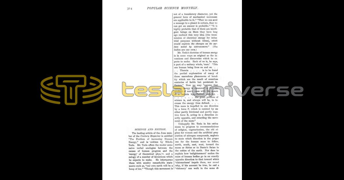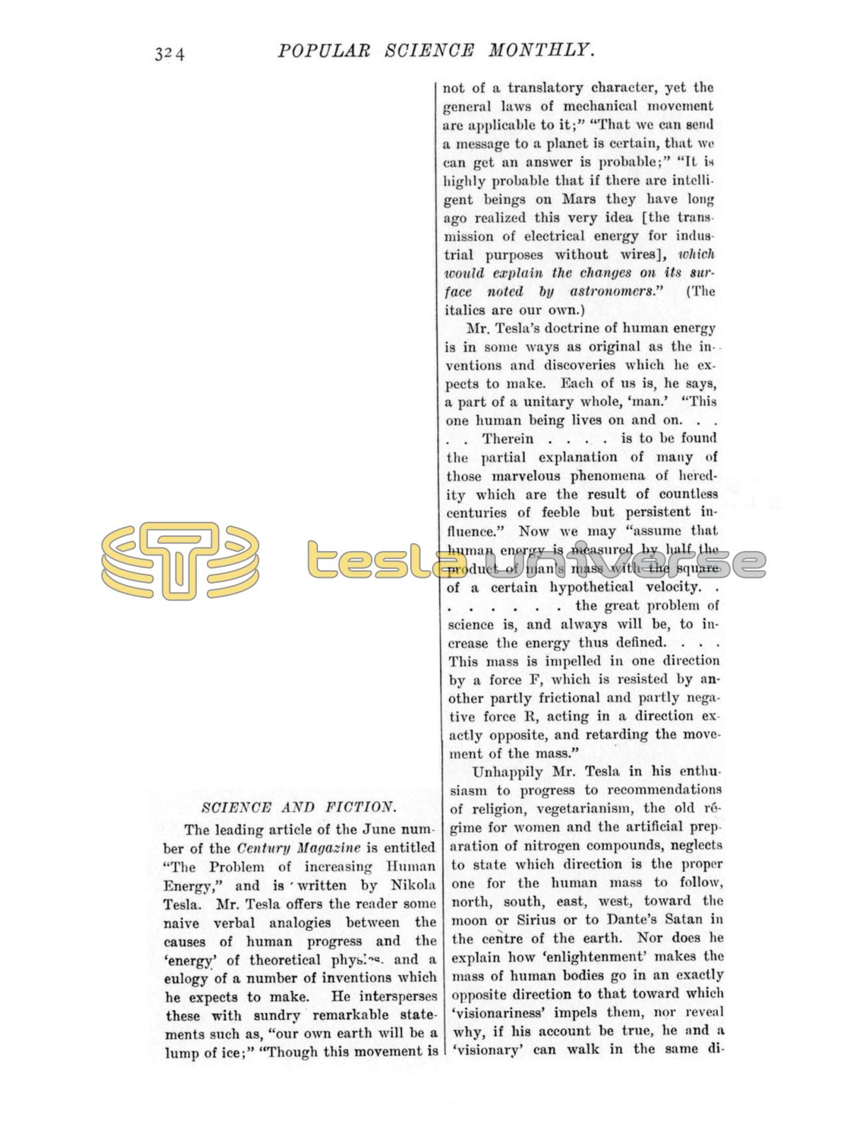 The leading article of the June number of the Century Magazine is entitled "The Problem of increasing Human Energy," and is written by Nikola Tesla. Mr. Tesla offers the reader some naive verbal analogies between the causes of human progress and the 'energy' of theoretical physis, and a eulogy of a number of inventions which he expects to make. He intersperses these with sundry remarkable statements such as, "our own earth will be a lump of ice;" "Though this movement is not of a translatory character, yet the general laws of mechanical movement are applicable to it;" "That we can send a message to a planet is certain, that we can get an answer is probable;" "It is highly probable that if there are intelligent beings on Mars they have long ago realized this very idea [the transmission of electrical energy for industrial purposes without wires], which would explain the changes on its surface noted by astronomers." (The italics are our own.)