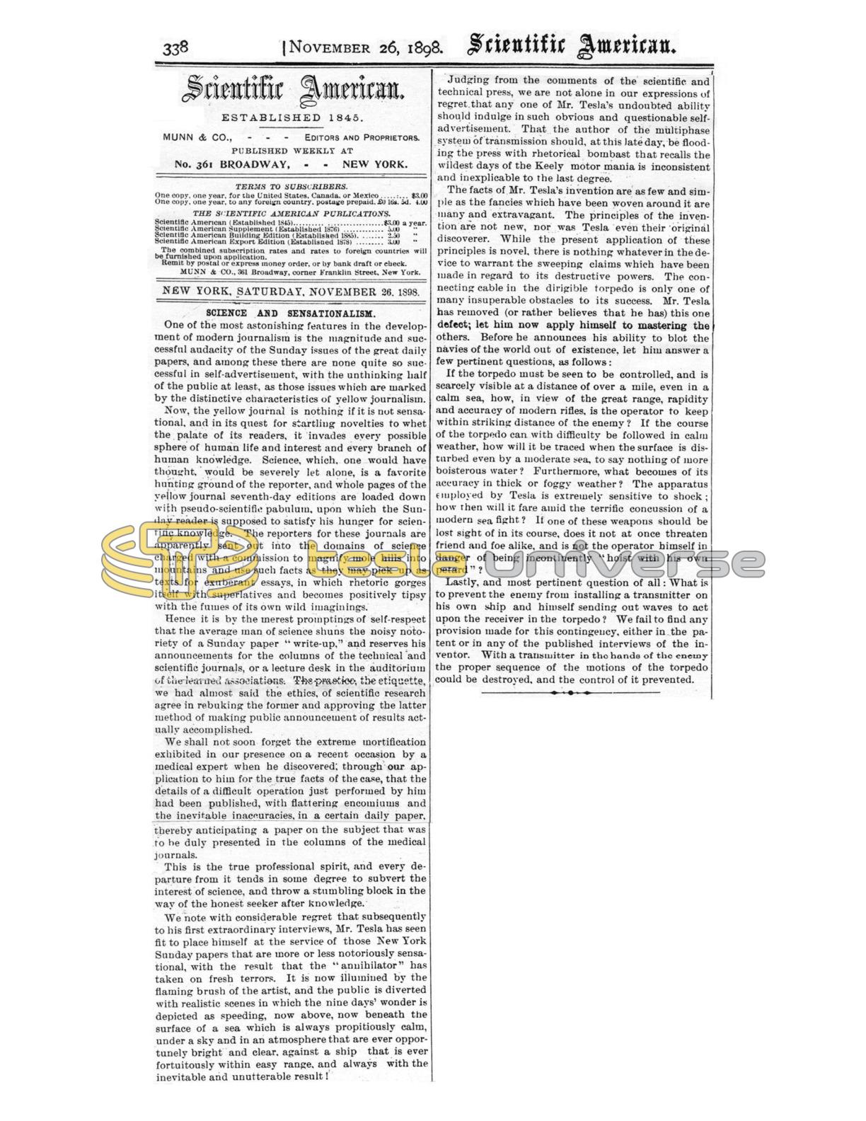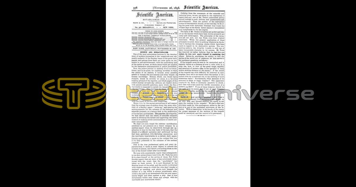We note with considerable regret that subsequently to his first extraordinary interviews, Mr. Tesla has seen fit to place himself at the service of those New York Sunday papers that are more or less notoriously sensational, with the result that the “annihilator” has taken on fresh terrors. It is now illumined by the flaming brush of the artist, and the public is diverted with realistic scenes in which the nine days’ wonder is depicted as speeding, now above, now beneath the surface of a sea which is always propitiously calm, under a sky and in an atmosphere that are ever opportunely bright and clear, against a ship that is ever fortuitously within easy range, and always with the inevitable and unutterable result!