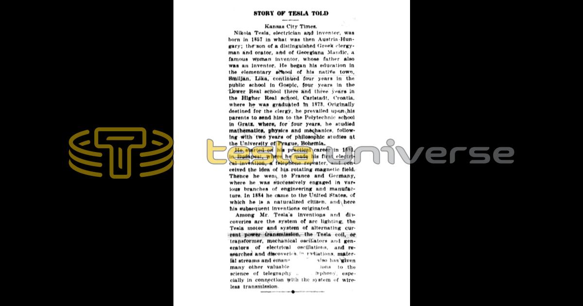 Nikola Tesla, electrician and inventor, was born in 1857 in what was then Austria-Hungary; the son of a distinguished Greek clergyman and orator, and of Georgiana Mandic, a famous woman inventor, whose father also was an inventor. He began his education in the elementary school of his native town, Smiljan, Lika, continued four years in the public school in Gospic, four years in the Lower Real school there and three years in the Higher Real school, Carlstadt, Croatia, where he was graduated in 1873, Originally destined for the clergy, he prevailed upon his parents to send him to the Polytechnic school in Gratz, where, for four years, he studied mathematics, physics and mechanics, following with two years of philosophic studies at the University of Prague, Bohemia.