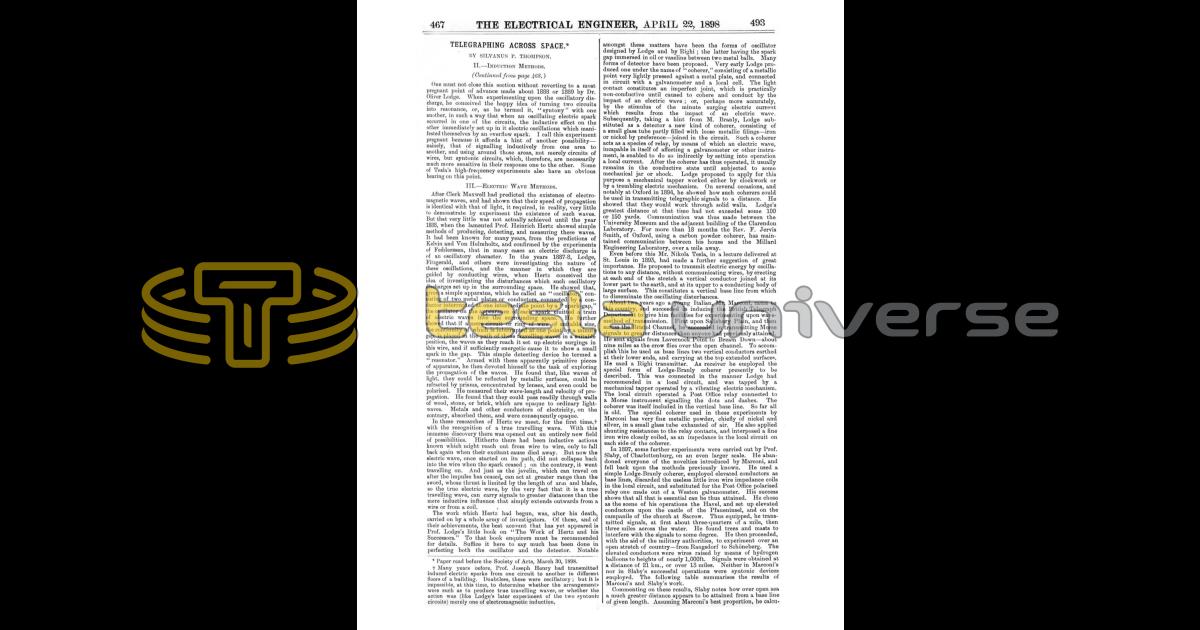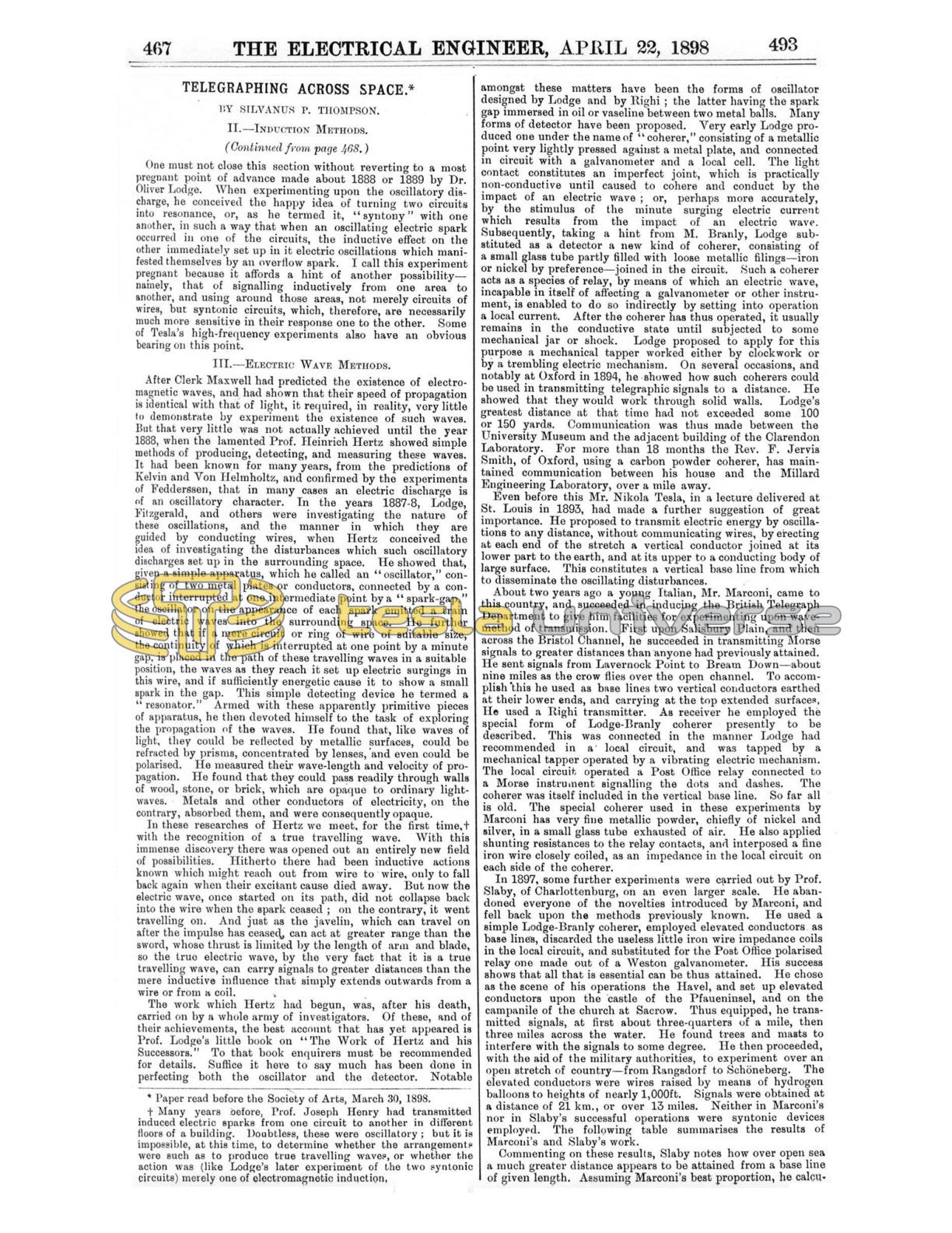 One must not close this section without reverting to a most pregnant point of advance made about 1888 or 1889 by Dr. Oliver Lodge. When experimenting upon the oscillatory discharge, he conceived the happy idea of turning two circuits into resonance, or, as he termed it, “syntony” with one another, in such a way that when an oscillating electric spark occurred in one of the circuits, the inductive effect on the other immediately set up in it electric oscillations which manifested themselves by an overflow spark. I call this experiment pregnant because it affords a hint of another possibility - namely, that of signalling inductively from one area to another, and using around those areas, not merely circuits of wires, but syntonic circuits, which, therefore, are necessarily much more sensitive in their response one to the other. Some of Tesla’s high-frequency experiments also have an obvious bearing on this point.
