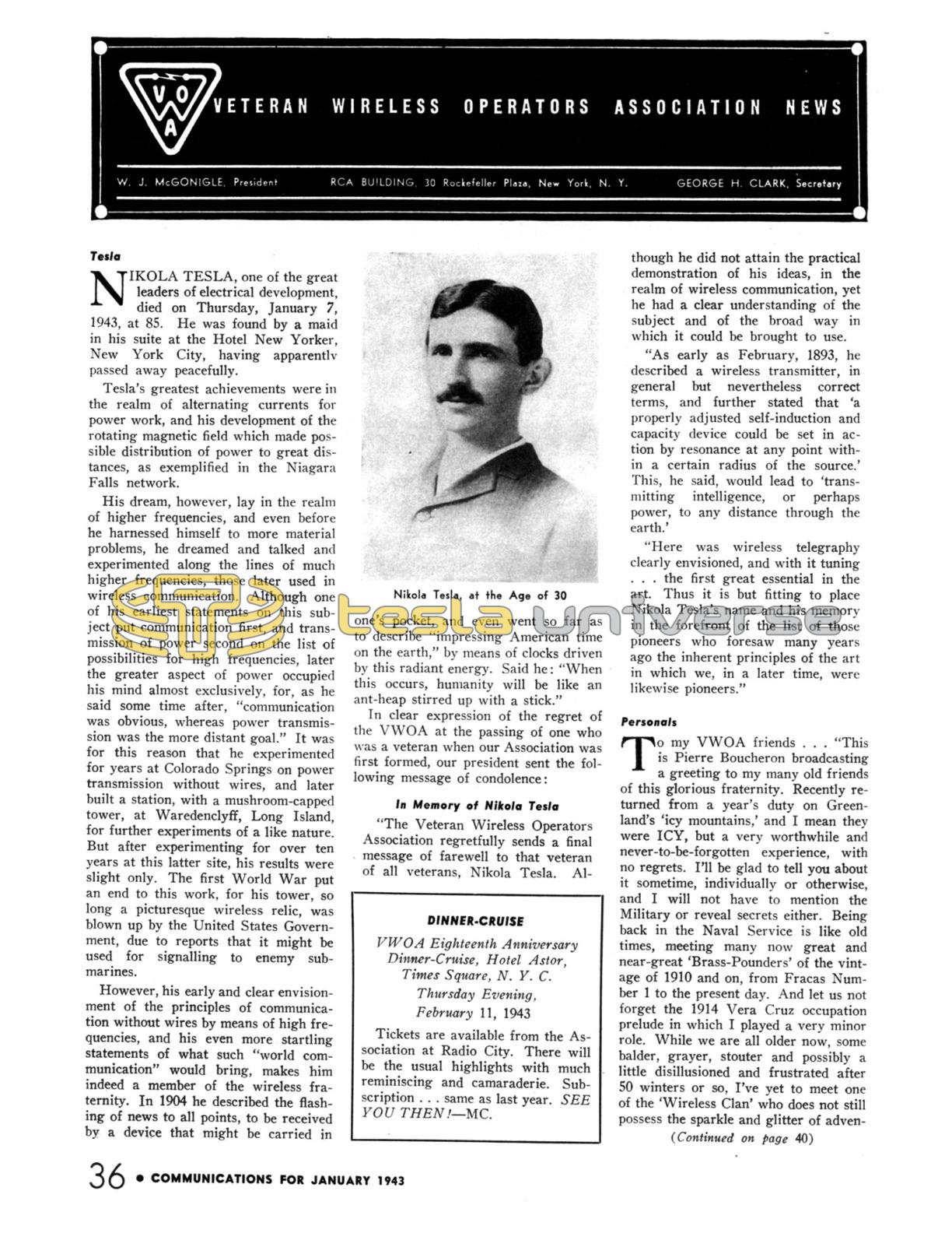“The Veteran Wireless Operators Association regretfully sends a final message of farewell to that veteran of all veterans, Nikola Tesla. Although he did not attain the practical demonstration of his ideas, in the realm of wireless communication, yet he had a clear understanding of the subject and of the broad way in which it could be brought to use.
