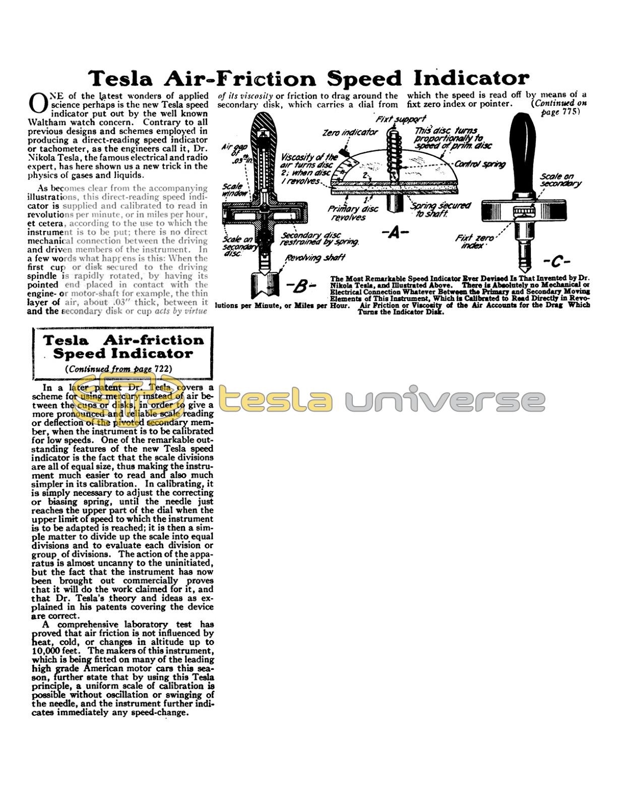 A comprehensive laboratory test has proved that air friction is not influenced by heat, cold, or changes in altitude up to 10,000 feet. The makers of this instrument, which is being fitted on many of the leading high grade American motor cars this season, further state that by using this Tesla principle, a uniform scale of calibration is possible without oscillation or swinging of the needle, and the instrument further indicates immediately any speed-change.