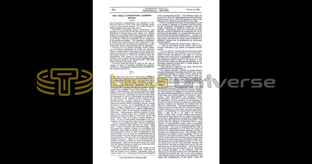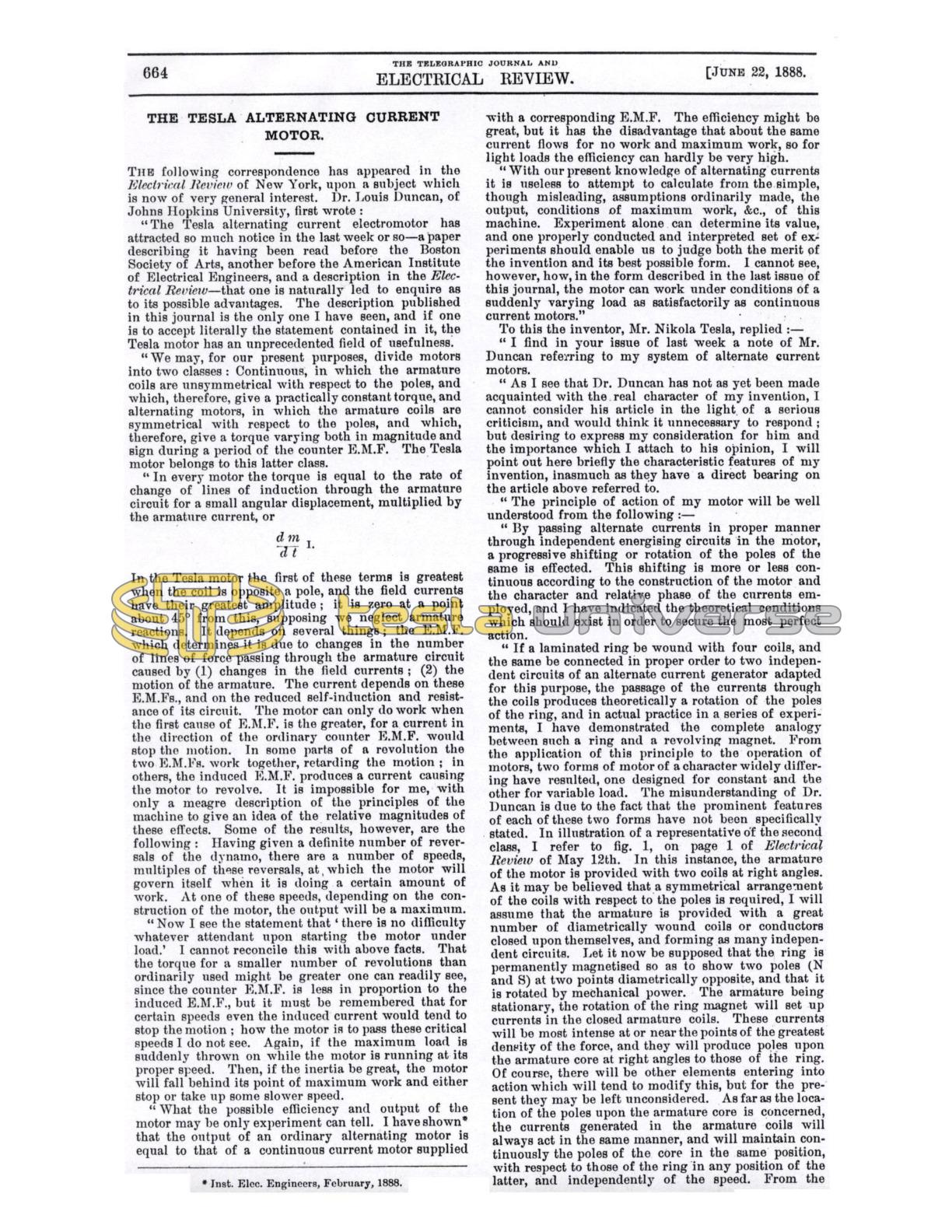 “The Tesla alternating current electromotor has attracted so much notice in the last week or so - a paper describing it having been read before the Boston Society of Arts, another before the American Institute of Electrical Engineers, and a description in the Electrical Review - that one is naturally led to enquire as to its possible advantages. The description published in this journal is the only one I have seen, and if one is to accept literally the statement contained in it, the Tesla motor has an unprecedented field of usefulness.