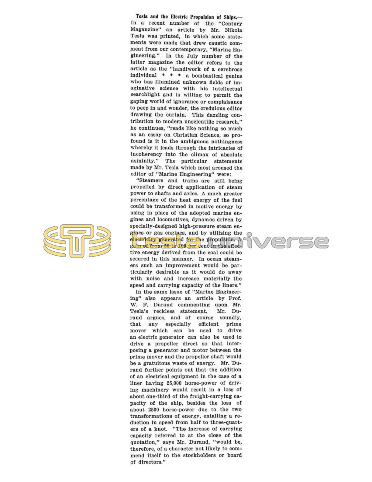 In the same issue of "Marine Engineering" also appears an article by Prof. W. F. Durand commenting upon Mr. Tesla's reckless statement. Mr. Durand argues, and of course soundly, that any especially efficient prime mover which can be used to drive an electric generator can also be used to drive a propeller direct so that interposing a generator and motor between the prime mover and the propeller shaft would be a gratuitous waste of energy. Mr. Durand further points out that the addition of an electrical equipment in the case of a liner having 25,000 horse-power of driving machinery would result in a loss of about one-third of the freight-carrying capacity of the ship, besides the loss of about 2500 horse-power due to the two transformations of energy, entailing a reduction in speed from half to three-quarters of a knot. "The increase of carrying capacity referred to at the close of the quotation," says Mr. Durand, "would be, therefore, of a character not likely to commend itself to the stockholders or board of directors."