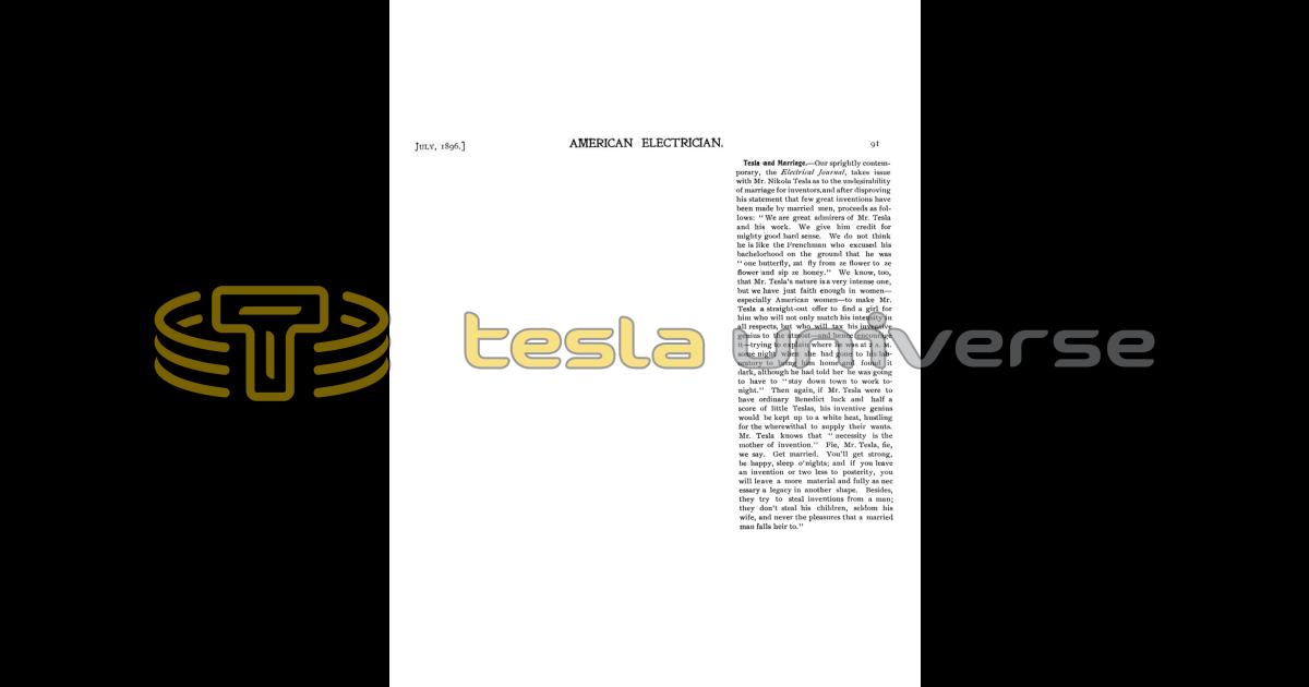 Our sprightly contemporary, the Electrical Journal, takes issue with Mr. Nikola Tesla as to the undesirability of marriage for inventors, and after disproving his statement that few great inventions have been made by married men, proceeds as follows: "We are great admirers of Mr. Tesla and his work. We give him credit for mighty good hard sense. We do not think he is like the Frenchman who excused his bachelorhood on the ground that he was "one butterfly, zat fly from ze flower to ze flower and sip ze honey." We know, too, that Mr. Tesla's nature is a very intense one, but we have just faith enough in women — especially American women — to make Mr. Tesla a straight-out offer to find a girl for him who will not only match his intensity in all respects, but who will tax his inventive genius to the utmost — and hence encourage it — trying to explain where he was at 2 A. M. some night when she had gone to his laboratory to bring him home and found it dark, although he had told her he was going to have to stay down town to work tonight." Then again, if Mr. Tesla were to have ordinary Benedict luck and half a score of little Teslas, his inventive genius would be kept up to a white heat, hustling for the wherewithal to supply their wants. Mr. Tesla knows that "necessity is the mother of invention." Fie, Mr. Tesla, fie, we say. Get married. You'll get strong, be happy, sleep o'nights; and if you leave an invention or two less to posterity, you will leave a more material and fully as necessary a legacy in another shape. Besides, they try to steal inventions from a man; they don't steal his children, seldom his wife, and never the pleasures that a married man falls heir to."