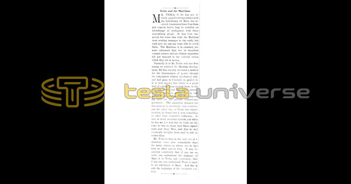 MR. TESLA, if he has not already opened correspondence with the inhabitants of Mars, has received communications from them and expects before long to establish an interchange of intelligence with those enterprising people. It has been suspected for some time that the Martians were sending messages to the earth, but until now no one has been able to catch them. The Martians, it is surmised, are more advanced than we in twentieth century science and our clumsy apparatus did not respond to the etherial waves which they set in motion.