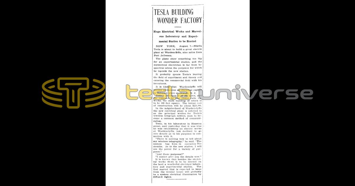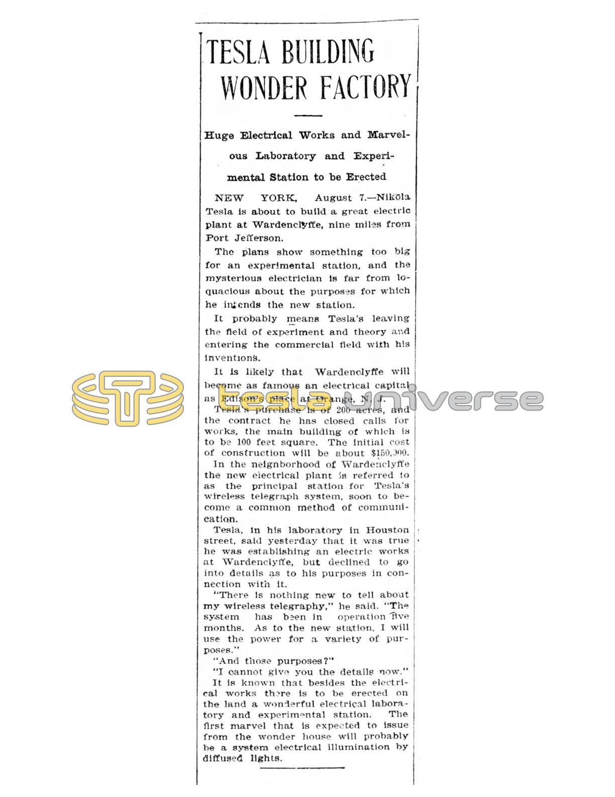 NEW YORK, August 7. — Nikola Tesla is about to build a great electric plant at Wardenclyffe, nine miles from Port Jefferson.