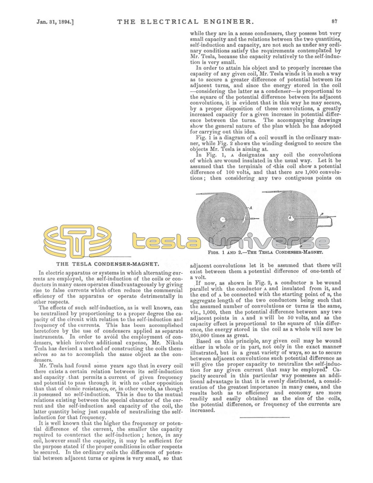 The effects of such self-induction, as is well known, can be neutralized by proportioning to a proper degree the capacity of the circuit with relation to the self-induction and frequency of the currents. This has been accomplished heretofore by the use of condensers applied as separate instruments. In order to avoid the employment of condensers, which involve additional expense, Mr. Nikola Tesla has devised a method of constructing the coils themselves so as to accomplish the same object as the condensers.