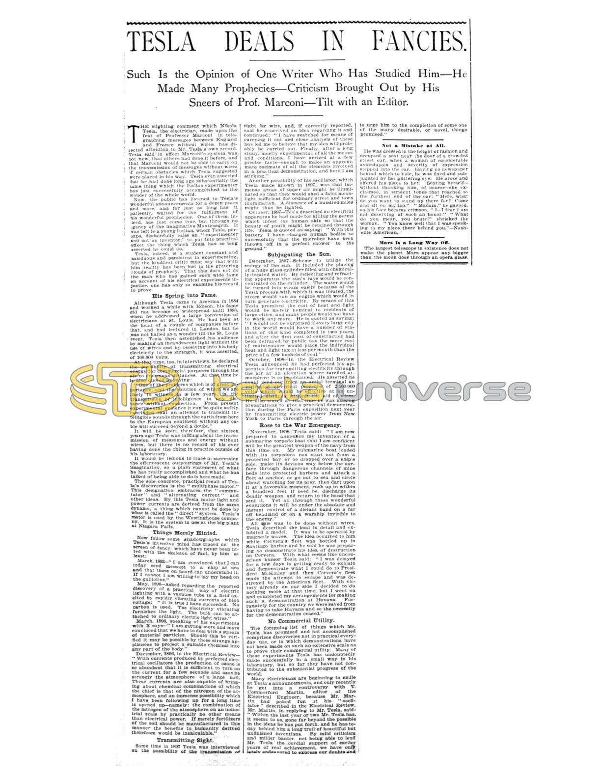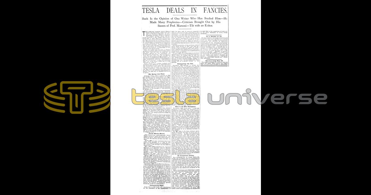 The slighting comment which Nikola Tesla, the electrician, made upon the feat of Professor Marconi in telegraphing messages between England and France without wires, has directed attention to Mr. Tesla's own record. Tesla said in effect Marconi's system was not new, that others had done it before, and that Marconi would not be able to carry on the transmission of messages without wires if certain obstacles which Tesla suggested were placed in his way. Tesla even asserted that he had done long ago substantially the same thing which the Italian experimenter has just successfully accomplished to the wonder of the whole world.