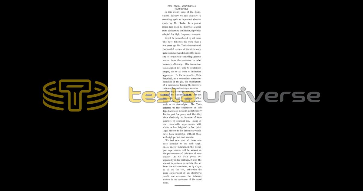 In this week's issue of the ELECTRICAL REVIEW we take pleasure in recording again an important advance made by Mr. Tesla. In a patent issued last week he describes a novel form of electrical condenser, especially adapted for high frequency currents.