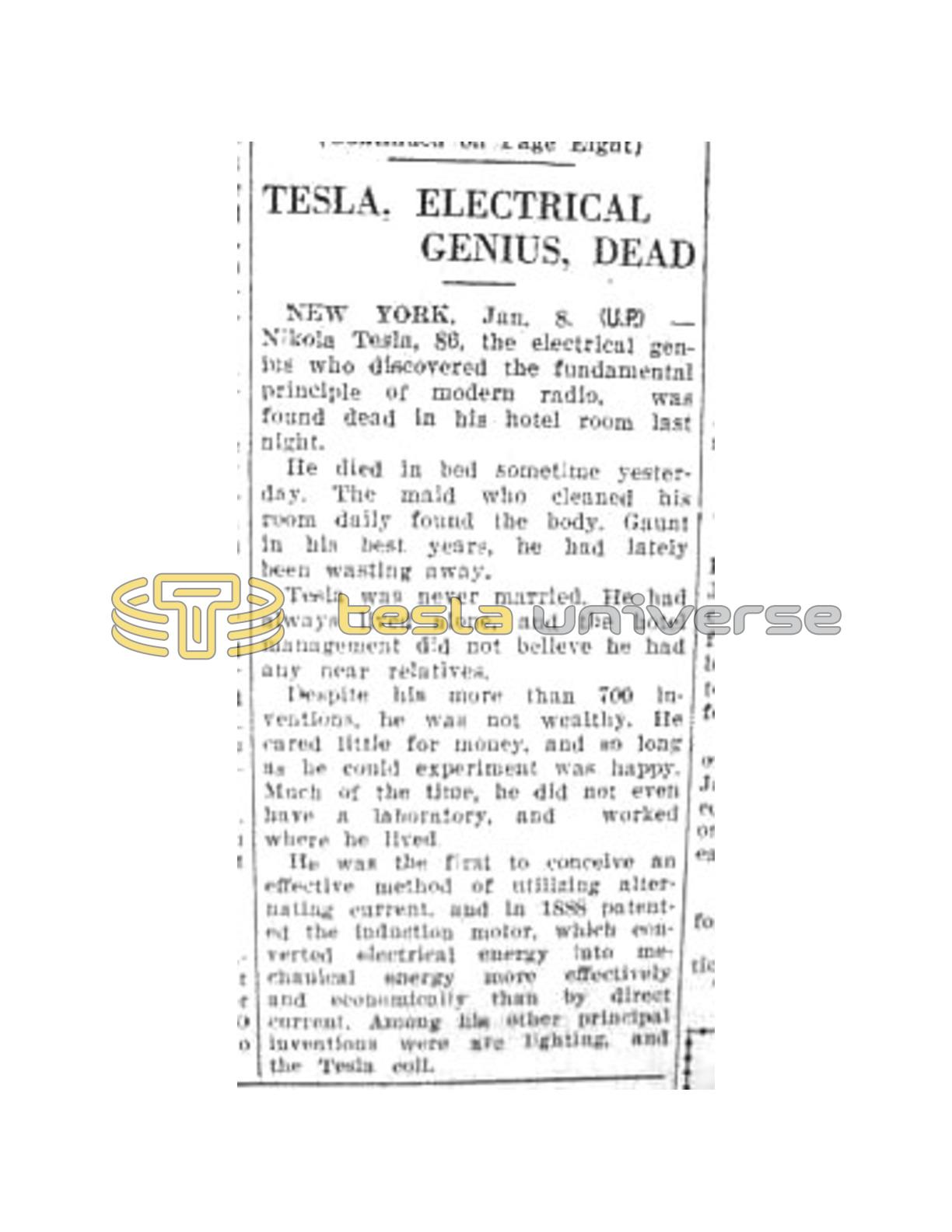New York, Jan. 8. (U.P.) — Nikola Tesla, 86, the electrical genius who discovered the fundamental principle of modern radio, was found dead in his hotel room last night.