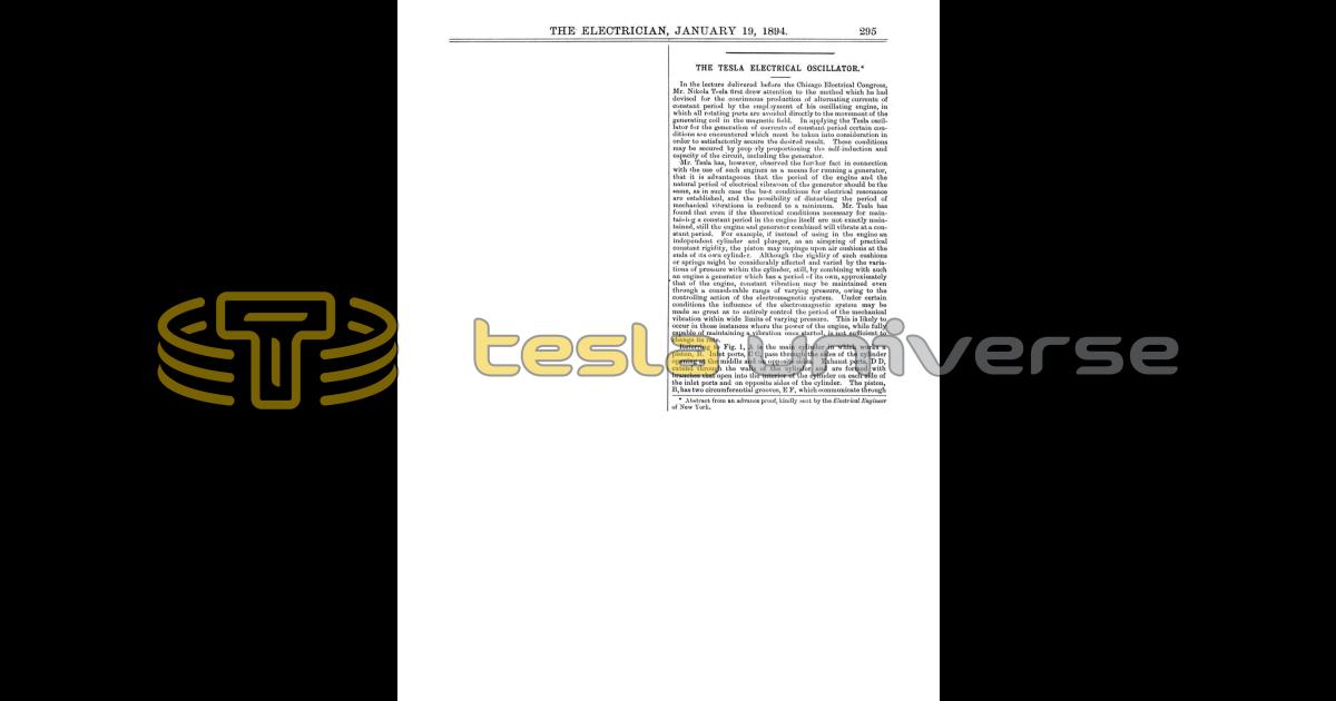 Nikola Tesla Articles Newspaper and magazine articles related to Nikola Tesla The Tesla Electrical Oscillator (Jan. 10, 1894) (reprint) Electrician January 19th, 1894 Page number(s): 295-297 This article is a reprint from Electrical Engineer of January 10, 1894 and is intentionally not duplicated here. Downloads Downloads for this article are available to members.Log in or join today to access all content. Downloads Downloads for this article are available to members.Log in or join today to access all content. Pagination Enjoy other articles First First item Previous Previous item Next Next item Last Last item Within the Universe Timeline Important moments and events related to Tesla. Articles Nikola Tesla in the press. Books Books written by and about Nikola Tesla. Documents Nikola Tesla documents, files and papers. Quotes Profound and insightful quotes by Nikola Tesla. Movies and TV Nikola Tesla on the screen. Patents Nikola Tesla held around 200 patents worldwide. Landmarks Locations related to Nikola Tesla. Images Nikola Tesla image and photo library. Show more Pagination Enjoy other articles First First item Previous Previous item Next Next item Last Last item Within the Universe Documents Nikola Tesla documents, files and papers. Quotes Profound and insightful quotes by Nikola Tesla. Books Books written by and about Nikola Tesla. Timeline Important moments and events related to Tesla. Patents Nikola Tesla held around 200 patents worldwide. Images Nikola Tesla image and photo library. Landmarks Locations related to Nikola Tesla. Letters Letters to, from and about Nikola Tesla. Movies and TV Nikola Tesla on the screen.