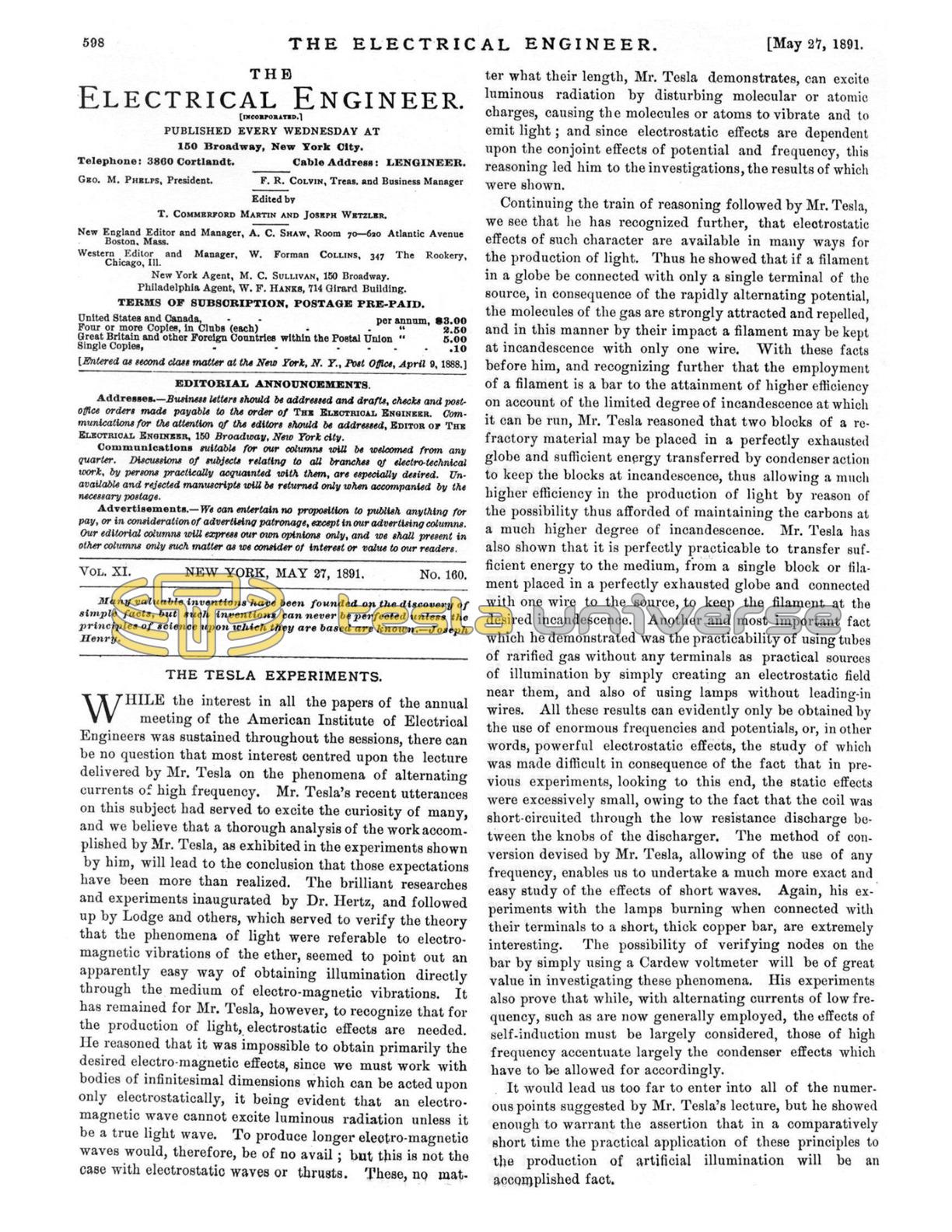 While the interest in all the papers of the annual meeting of the American Institute of Electrical Engineers was sustained throughout the sessions, there can be no question that most interest centred upon the lecture delivered by Mr. Tesla on the phenomena of alternating currents of high frequency. Mr. Tesla’s recent utterances on this subject had served to excite the curiosity of many, and we believe that a thorough analysis of the work accomplished by Mr. Tesla, as exhibited in the experiments shown by him, will lead to the conclusion that those expectations have been more than realized.