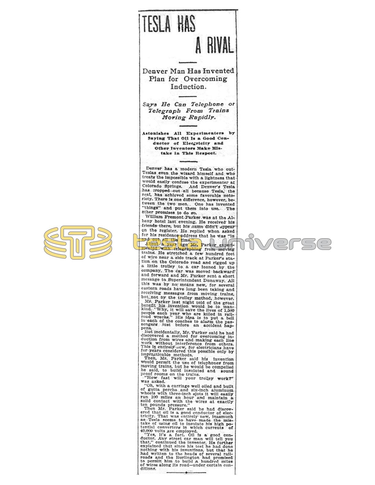 But incidentally, Mr. Parker said he had discovered a method for overcoming induction from wires and making each line work without interference from others. This is entirely new, for electricians have for years considered this possible only by impracticable methods.
