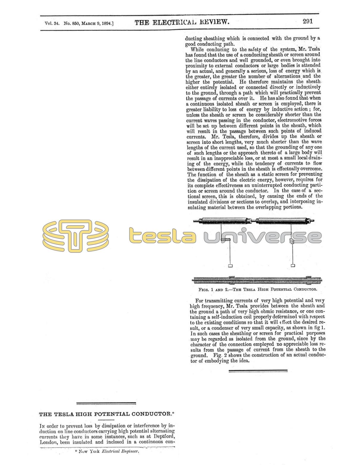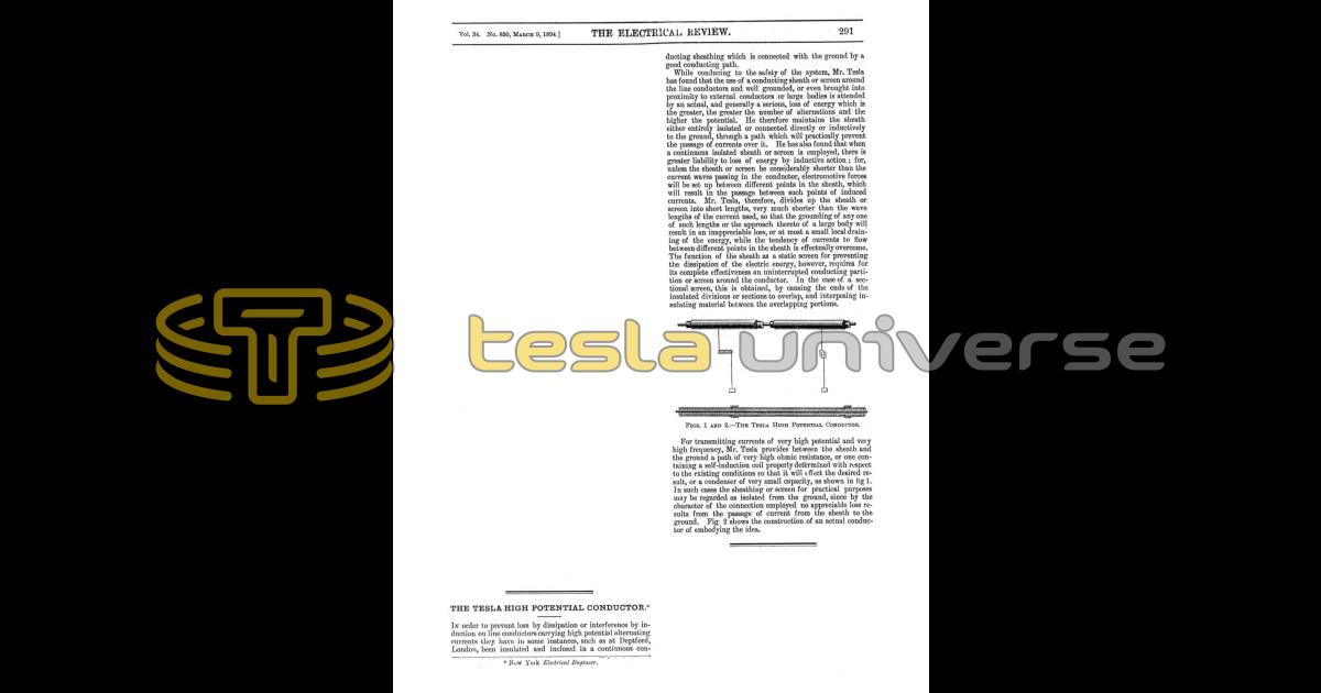 Nikola Tesla Articles Newspaper and magazine articles related to Nikola Tesla The Tesla High Potential Conductor (Reprint 2) Electrician March 9th, 1894 Page number(s): 291 This article is a reprint from the Electrical Engineer of February 14, 1894 and is intentionally not duplicated here. Downloads Downloads for this article are available to members.Log in or join today to access all content. Downloads Downloads for this article are available to members.Log in or join today to access all content. Pagination Enjoy other articles First First item Previous Previous item Next Next item Last Last item Within the Universe Timeline Important moments and events related to Tesla. Articles Nikola Tesla in the press. Books Books written by and about Nikola Tesla. Documents Nikola Tesla documents, files and papers. Quotes Profound and insightful quotes by Nikola Tesla. Movies and TV Nikola Tesla on the screen. Patents Nikola Tesla held around 200 patents worldwide. Landmarks Locations related to Nikola Tesla. Images Nikola Tesla image and photo library. Show more Pagination Enjoy other articles First First item Previous Previous item Next Next item Last Last item Within the Universe Documents Nikola Tesla documents, files and papers. Quotes Profound and insightful quotes by Nikola Tesla. Books Books written by and about Nikola Tesla. Timeline Important moments and events related to Tesla. Patents Nikola Tesla held around 200 patents worldwide. Images Nikola Tesla image and photo library. Landmarks Locations related to Nikola Tesla. Letters Letters to, from and about Nikola Tesla. Movies and TV Nikola Tesla on the screen.