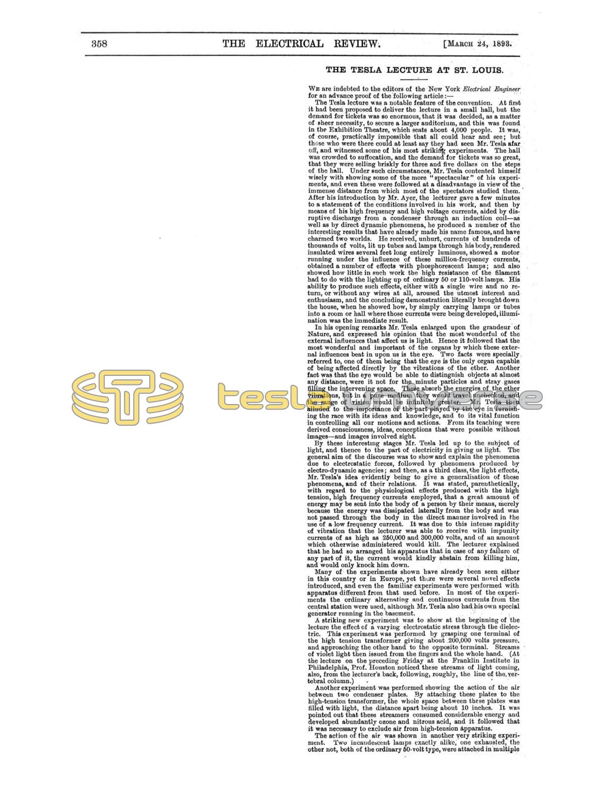 Nikola Tesla Articles Newspaper and magazine articles related to Nikola Tesla The Tesla Lecture at St. Louis (Reprint) Electrical Review March 24th, 1893 Page number(s): 358-359 This article is a reprint from Electrical Engineer of March 8, 1893 and is intentionally not duplicated here. Downloads Downloads for this article are available to members.Log in or join today to access all content. Downloads Downloads for this article are available to members.Log in or join today to access all content. Pagination Enjoy other articles First First item Previous Previous item Next Next item Last Last item Within the Universe Timeline Important moments and events related to Tesla. Articles Nikola Tesla in the press. Books Books written by and about Nikola Tesla. Documents Nikola Tesla documents, files and papers. Quotes Profound and insightful quotes by Nikola Tesla. Movies and TV Nikola Tesla on the screen. Patents Nikola Tesla held around 200 patents worldwide. Landmarks Locations related to Nikola Tesla. Images Nikola Tesla image and photo library. Show more Pagination Enjoy other articles First First item Previous Previous item Next Next item Last Last item Within the Universe Documents Nikola Tesla documents, files and papers. Quotes Profound and insightful quotes by Nikola Tesla. Books Books written by and about Nikola Tesla. Timeline Important moments and events related to Tesla. Patents Nikola Tesla held around 200 patents worldwide. Images Nikola Tesla image and photo library. Landmarks Locations related to Nikola Tesla. Letters Letters to, from and about Nikola Tesla. Movies and TV Nikola Tesla on the screen.