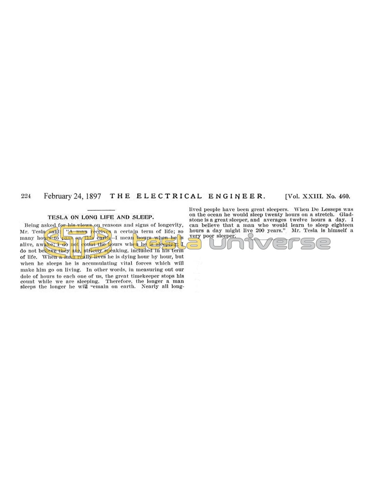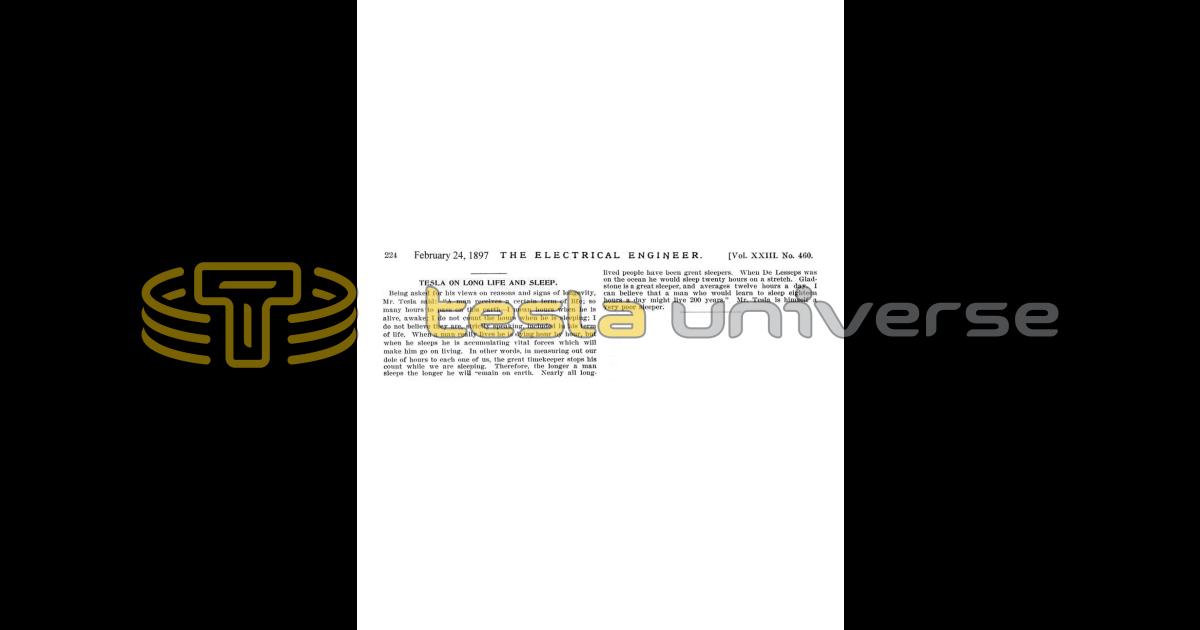 Being asked for his views on reasons and signs of longevity, Mr. Tesla said: "A man receives a certain term of life; so many hours to pass on this earth — I mean hours when he is alive, awake; I do not count the hours when he is sleeping; I do not believe they are, strictly speaking, included in his term of life. When a man really lives he is dying hour by hour, but when he sleeps he is accumulating vital forces which will make him go on living. In other words, in measuring out our dole of hours to each one of us, the great timekeeper stops his count while we are sleeping. Therefore, the longer a man sleeps the longer he will remain on earth. Nearly all long-lived people have been great sleepers. When De Lesseps was on the ocean he would sleep twenty hours on a stretch. Gladstone is a great sleeper, and averages twelve hours a day. I can believe that a man who would learn to sleep eighteen hours a day might live 200 years." Mr. Tesla is himself a very poor sleeper.
