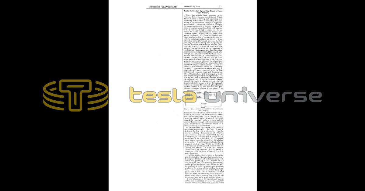 There has already been presented in the Western Electrician a description of Nikola Tesla’s method of starting and operating synchronizing motors which involved the transformation of the motor from a torque to a synchronizing motor. This method consists in changing the circuit connections so that on the start the poles or resultant attraction of the field magnets of the motor were shifted or rotated by the action of the current until the motor reached synchronous speed, after which the poles were merely alternated. Mr. Tesla has recently patented another method of accomplishing this result, the main features being as follows: If an alternating current be passed through the field coils only of a motor having two energizing circuits of different self-induction and the armature coils be short circuited, the motor will have a strong torque, but little or no tendency to synchronism with the generator; but if the same current which energizes the field be passed also through the armature coils the tendency to remain in synchronism is very considerably increased. This is due to the fact that the maximum magnetic effects produced in the field at and armature more nearly coincide. In other words, a motor is constructed having independent field circuits of different self-induction. These are joined in derivation to a source of alternating currents. The armature is wound with one or more coils, which are connected with the field coils through contact rings and brushes, and around the armature coils is arranged a shunt with means for opening or closing the same. In starting this motor the shunt is closed around the armature coils. When the current is directed through the motor, it divides between the two circuits, which, by reason of their different self-induction, secure a difference of phase between the two currents in the two branches, that produces a shifting or rotation of the poles. By the alternations of current other currents are induced in the closed - or short-circuited - armature coils and the motor has a strong torque. When the desired speed is reached the shunt around the armature coils is opened and the current directed through both armature and field coils. Under these conditions the motor has a strong tendency to synchronism.