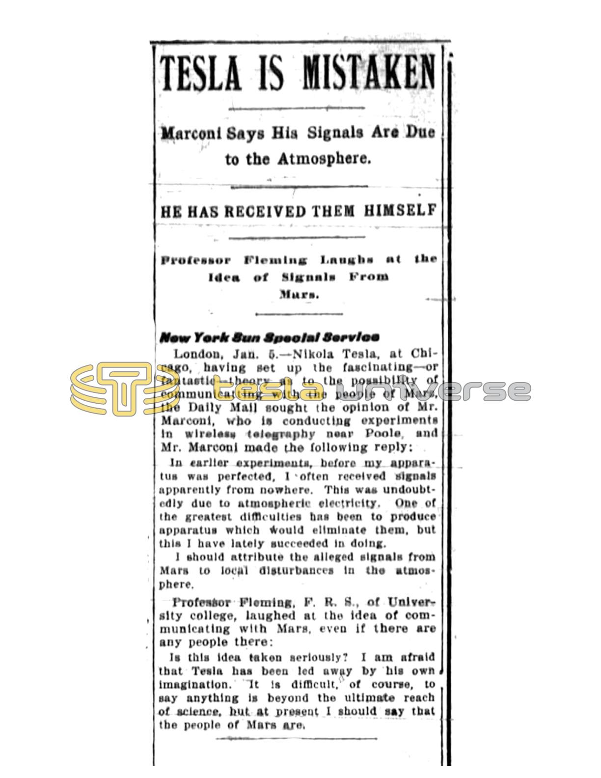 London, Jan. 5. — Nikola Tesla, at Chicago, having set up the fascinating — or fantastic — theory as to the possibility of communicating with the people of Mars, the Daily Mail sought the opinion of Mr. Marconi, who is conducting experiments in wireless telegraphy near Poole, and Mr. Marconi made the following reply: