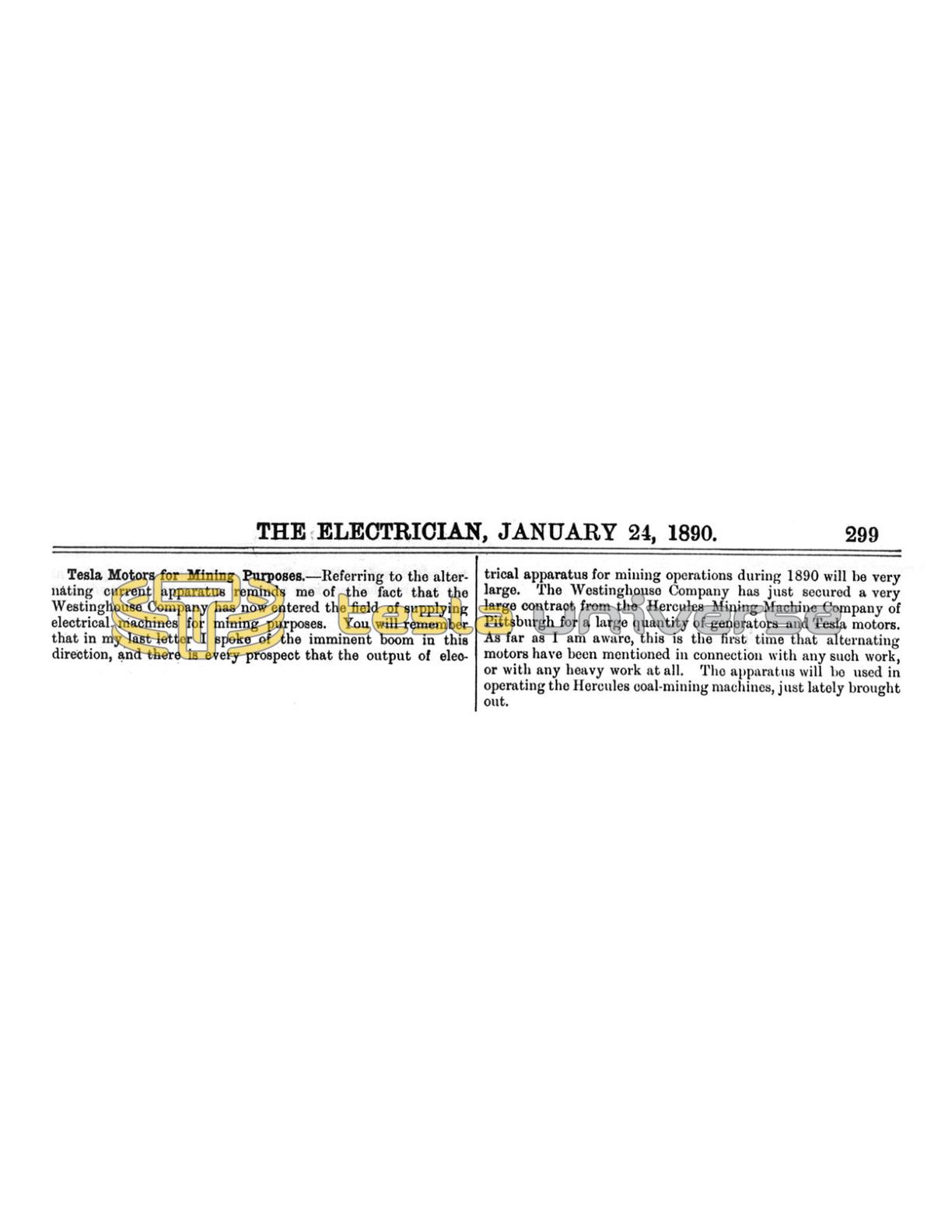 Referring to the alternating current apparatus reminds me of the fact that the Westinghouse Company has now entered the field of supplying electrical machines for mining purposes. You will remember that in my last letter I spoke of the imminent boom in this direction, and there is every prospect that the output of electrical apparatus for mining operations during 1890 will be very large. The Westinghouse Company has just secured a very large contract from the Hercules Mining Machine Company of Pittsburgh for a large quantity of generators and Tesla motors. As far as I am aware, this is the first time that alternating motors have been mentioned in connection with any such work, or with any heavy work at all. The apparatus will be used in operating the Hercules coal-mining machines, just lately brought out.